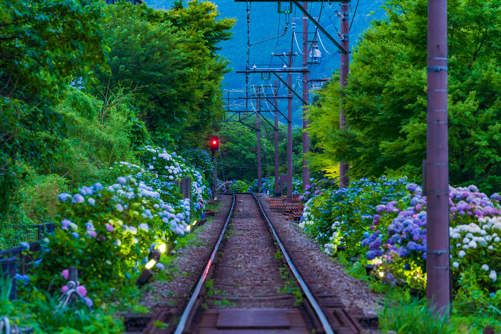 箱根湯本駅から強羅駅までの線路沿いには、色とりどりのあじさいが綺麗に咲いています。夜はライトアップも行われ、車窓から眺める景色はとても幻想的です。