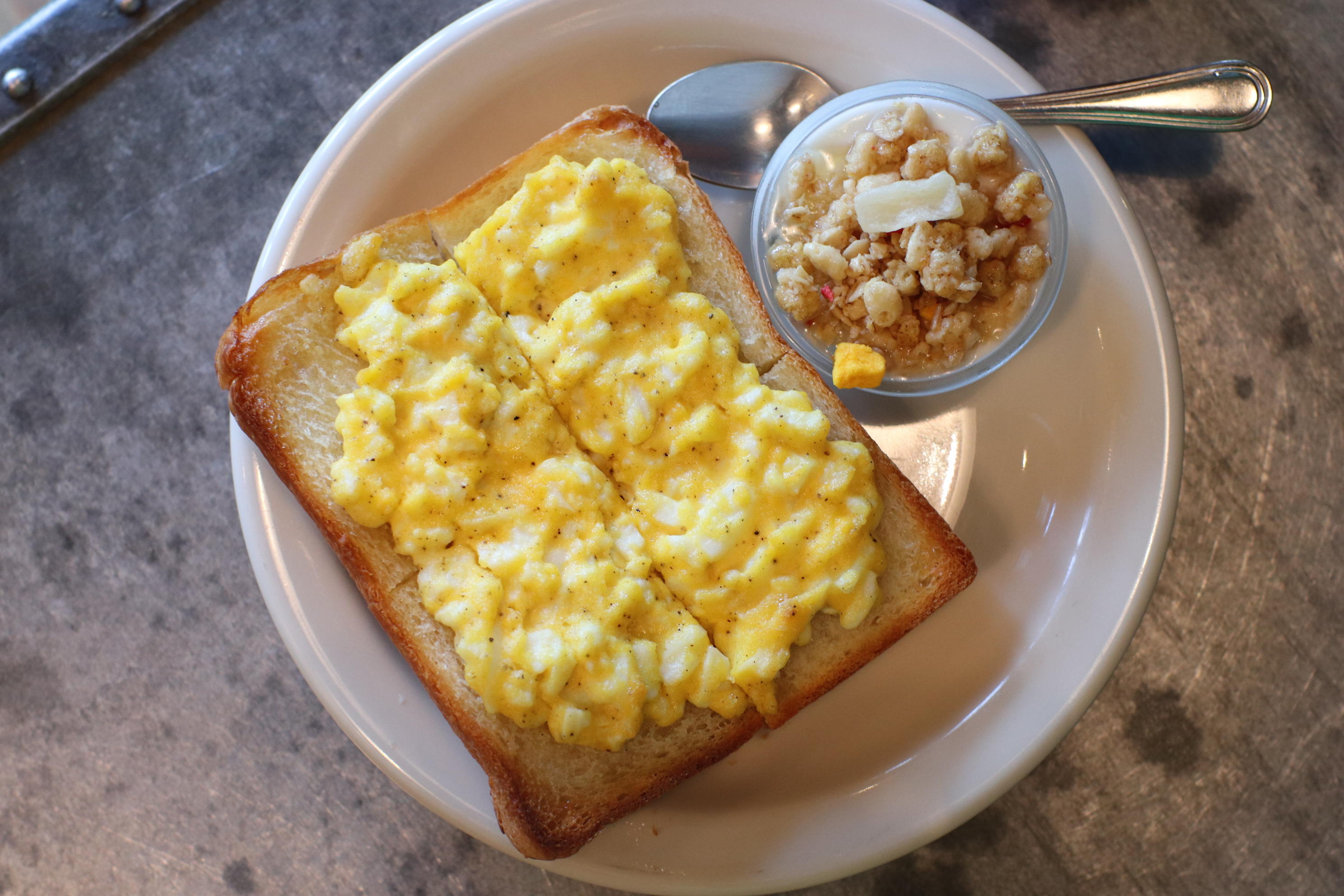 人気ベーカリー、カタネベーカリーさんの食パンを使用したトーストの上にはふわふわの卵が。