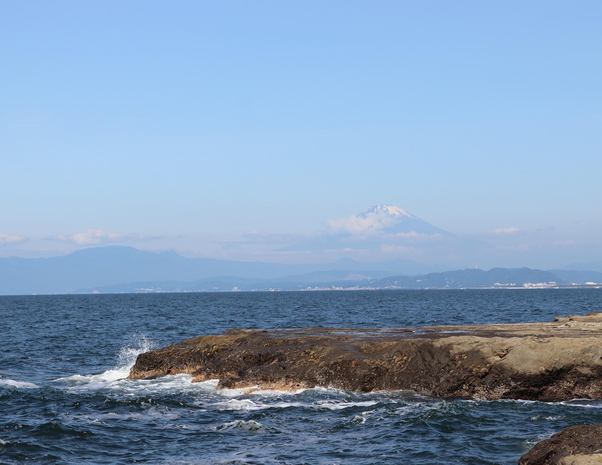 江ノ島内を歩いて、階段の登り降りを経て着いた先は、太平洋と富士山、箱根の山々の絶景。小さい頃はカニを捕りによくいきました。生き物を探すのも楽しいですよ♪