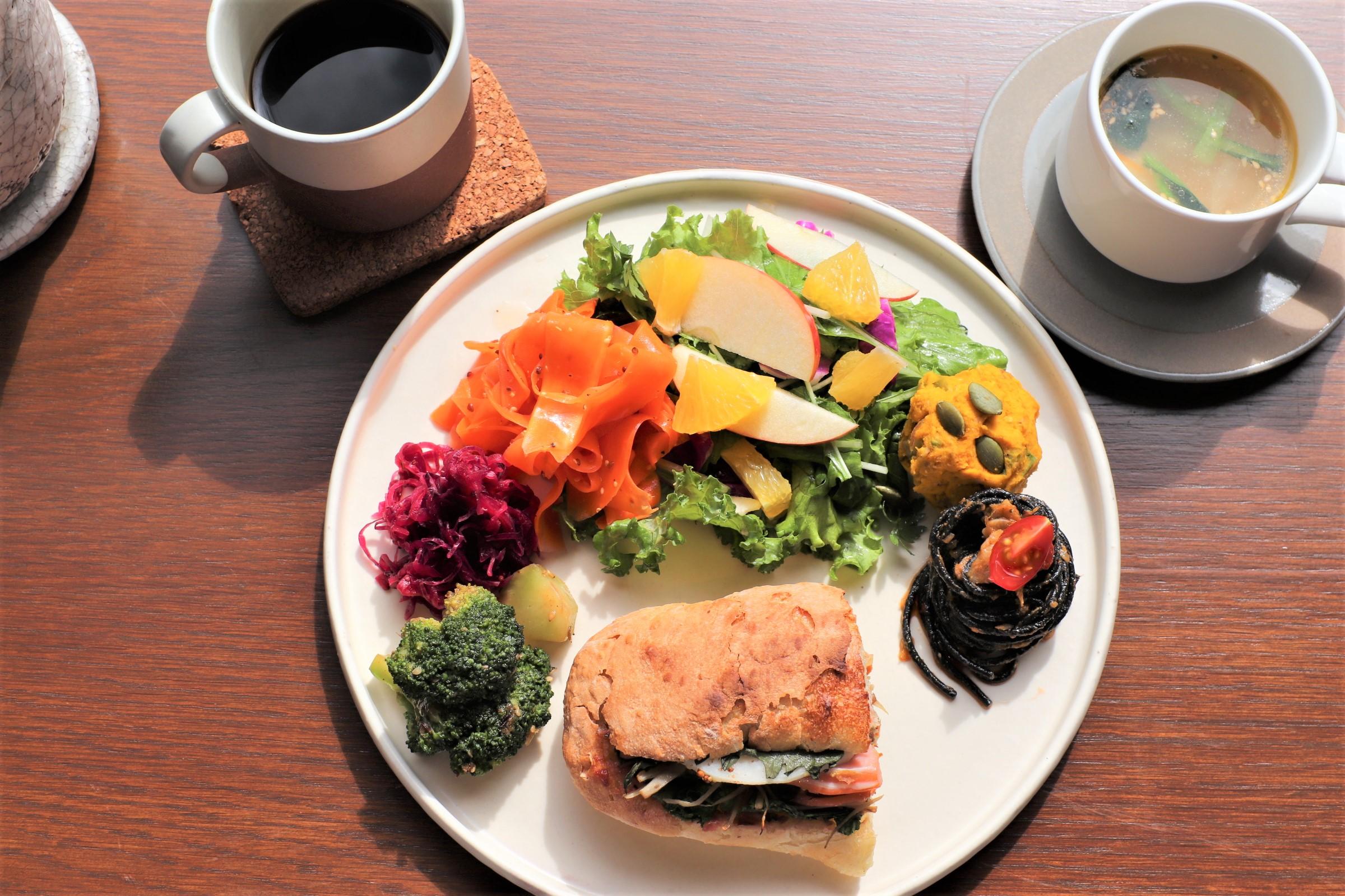 また、お食事には、季節のデリやスープ、選べるサンドウィッチが乗ったワンプレートメニューが大人気。彩り豊かなデリの数々は、見た目にも舌にも美味しそうです。
