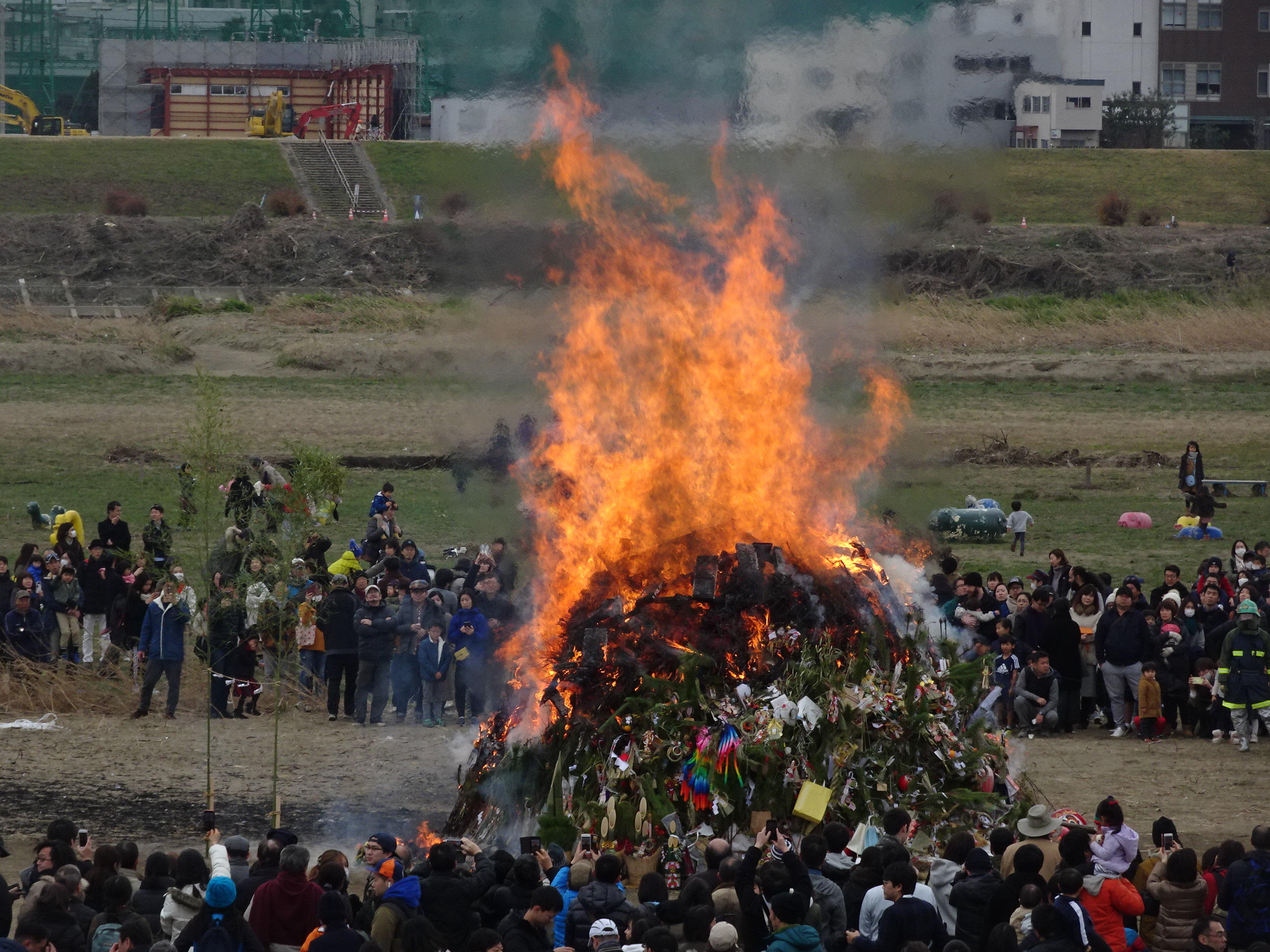 今年は台風19号の影響で多摩川が氾濫したため、会場周辺では台風の影響が残ったまま、また、葦が流されてしまったため、どんど焼きに使う葦を集めるのに大変苦労されたそうです。