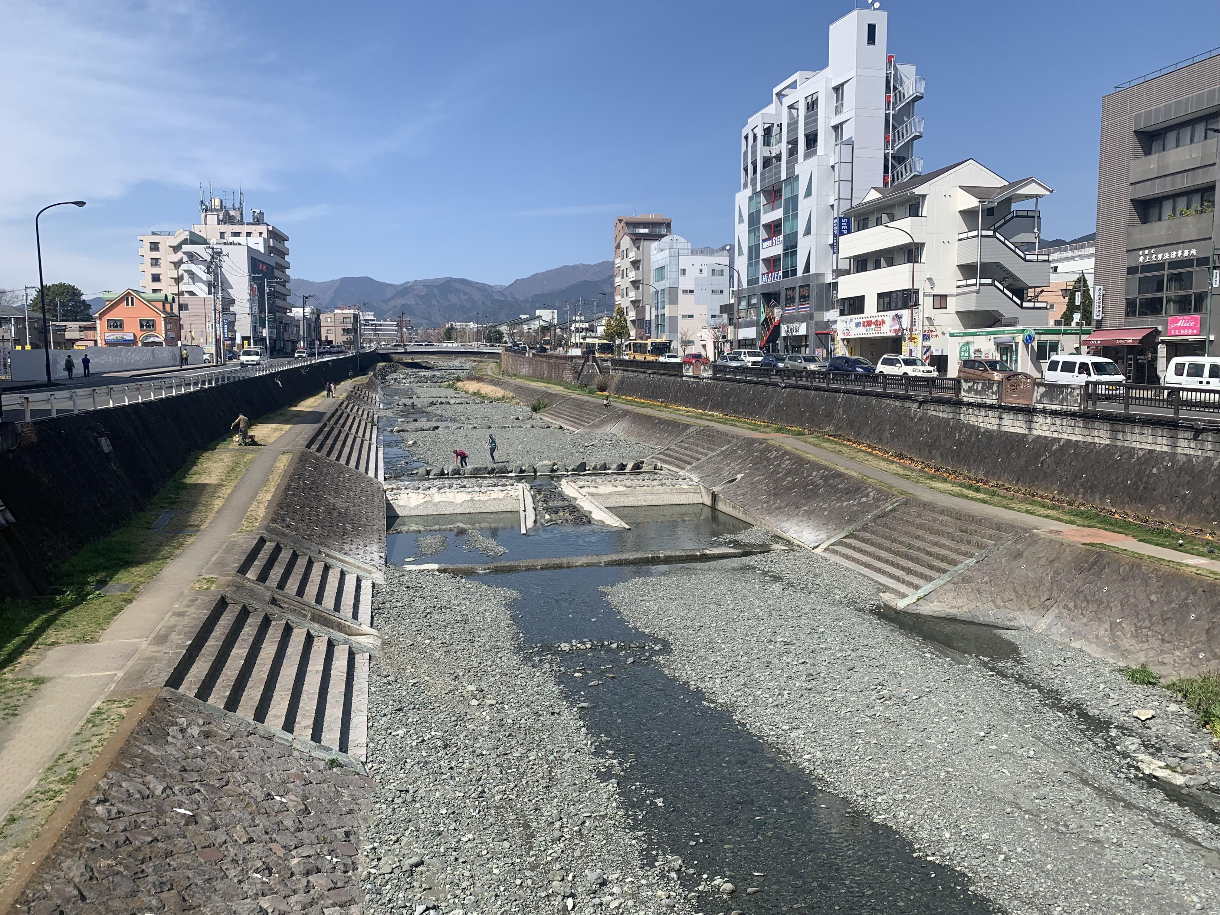 駅前のビルやマンションが、水無川を真ん中にしてぱっくり割れて並んでいる。