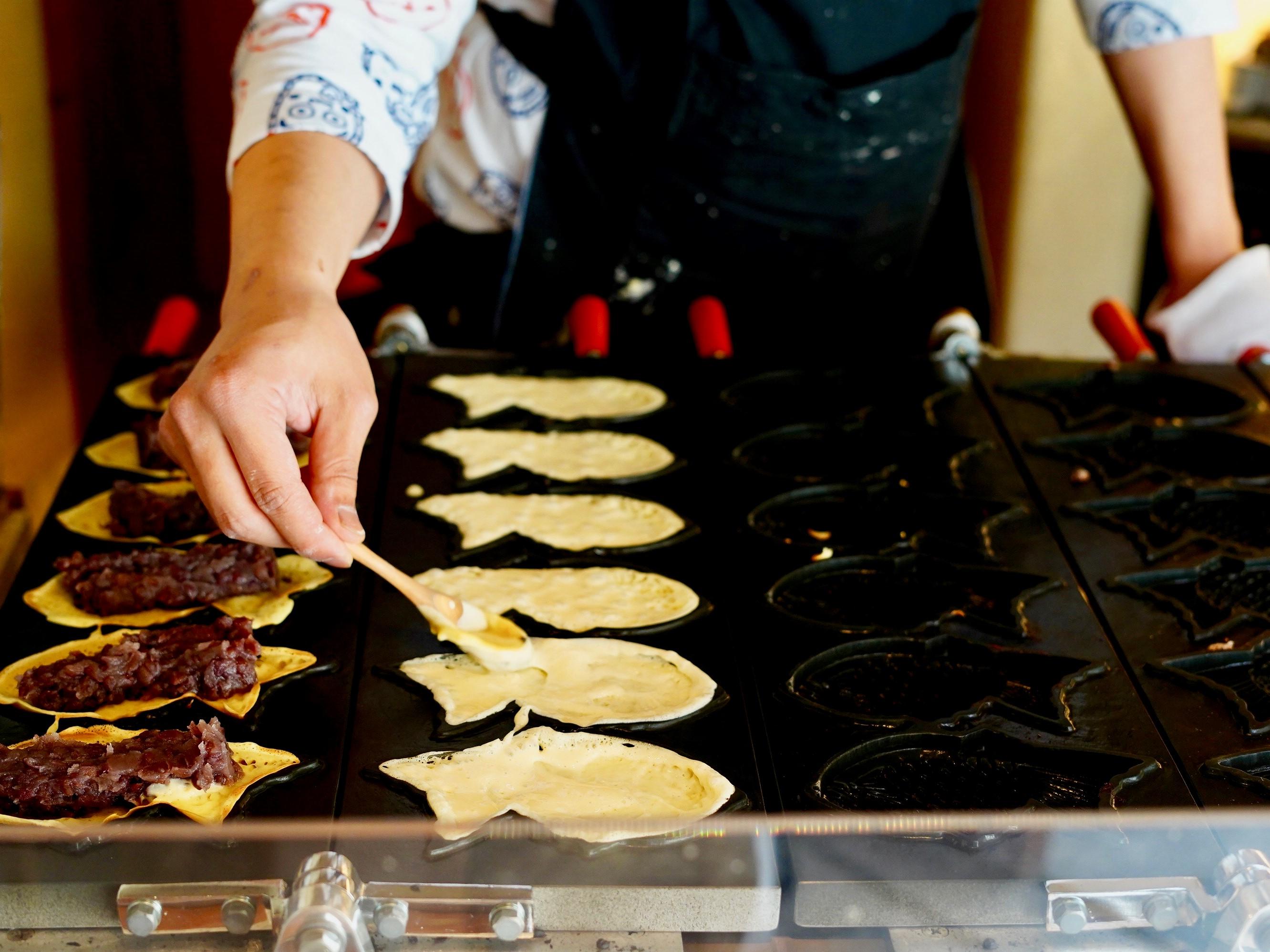 たい焼きは1つの台で6匹焼く、いわば養殖タイプ。小豆は北海道産小豆を使い、和菓子を学んだ店員さんが、優しく炊いた粒あんを使っています。
