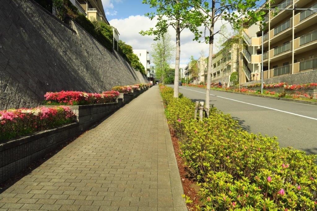 新百合山手西通り左側歩道を麻生郵便局前よりの風景。