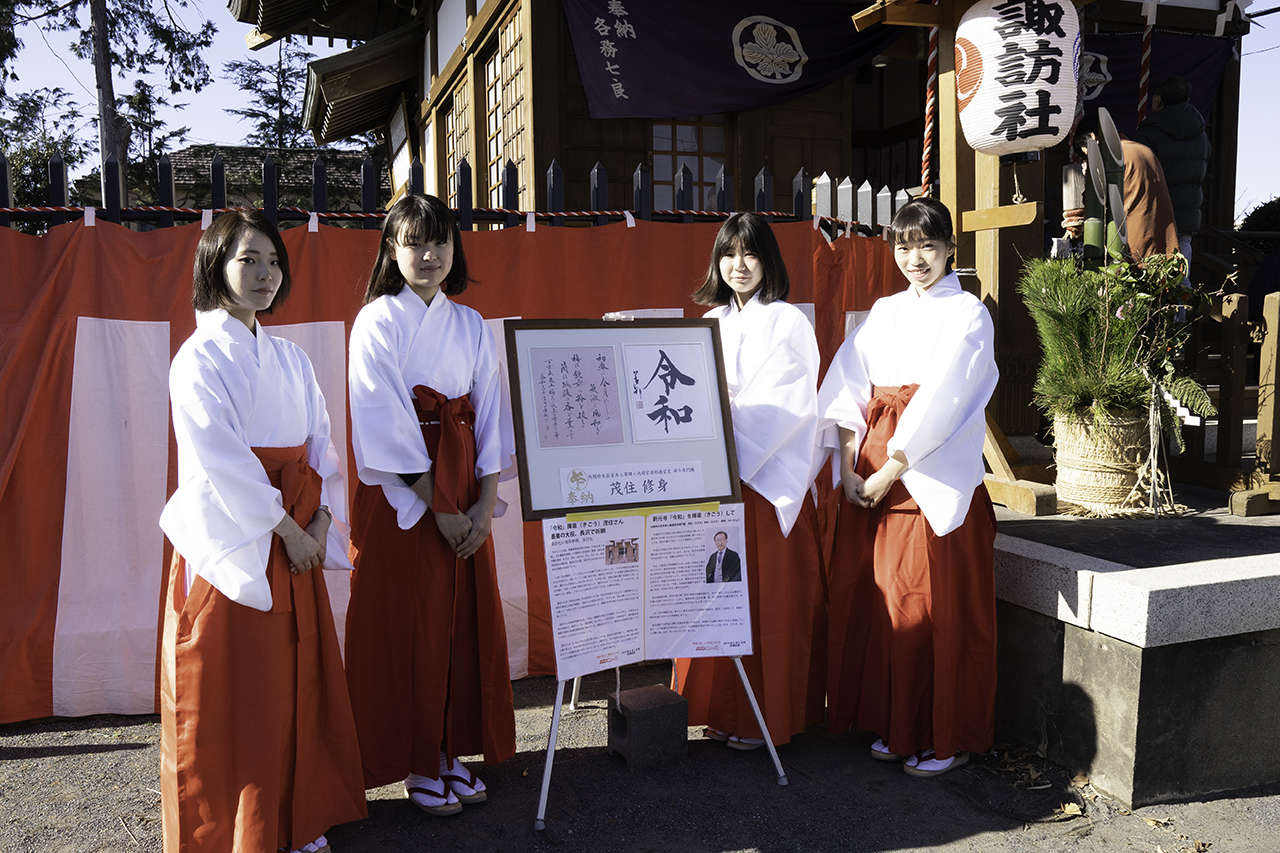 元日の昼、地域の小学生、中学生、高校生、大学生が巫女さんとして参拝者を接待。