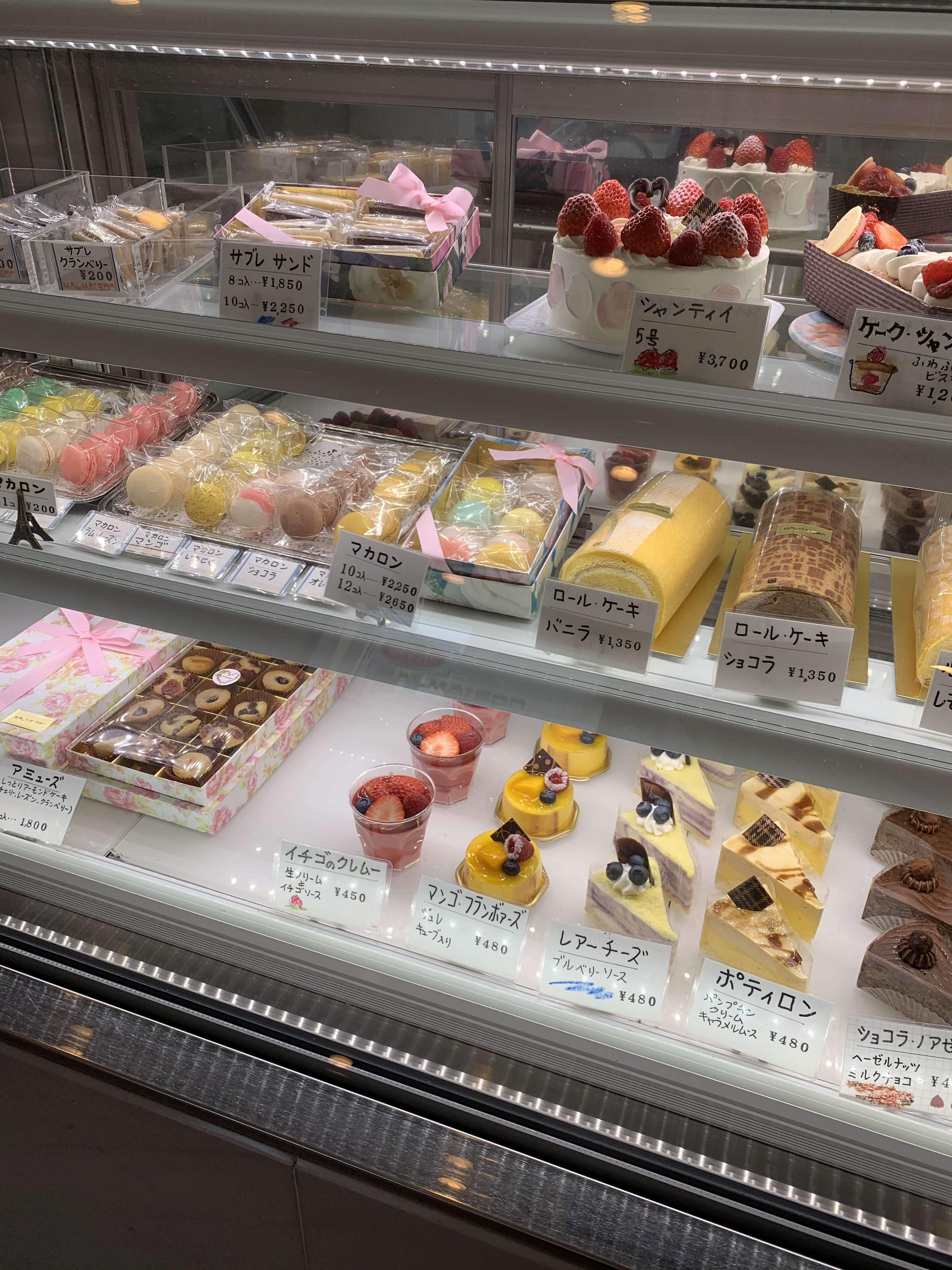 色とりどりのケーキが並んでおり、マカロンなどもあります。
