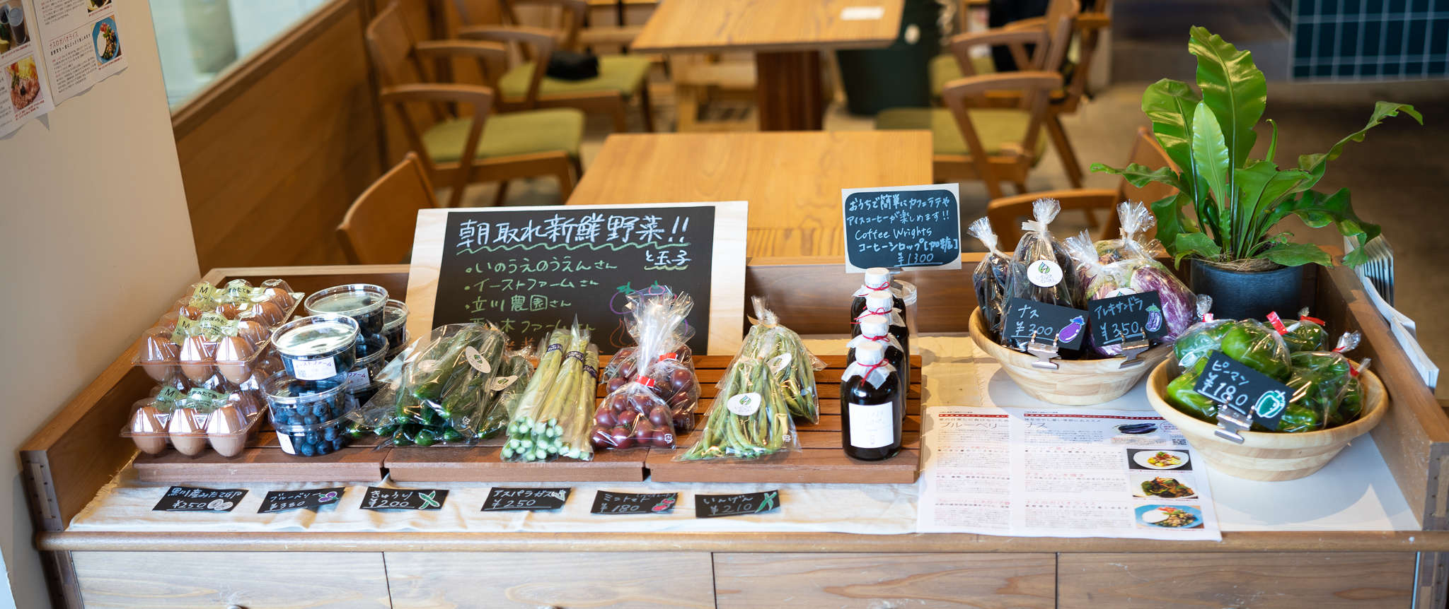 栗平駅前にある「cafe & space L.D.K.」では毎週金曜、土曜に近隣農家さんの野菜などを販売しています。