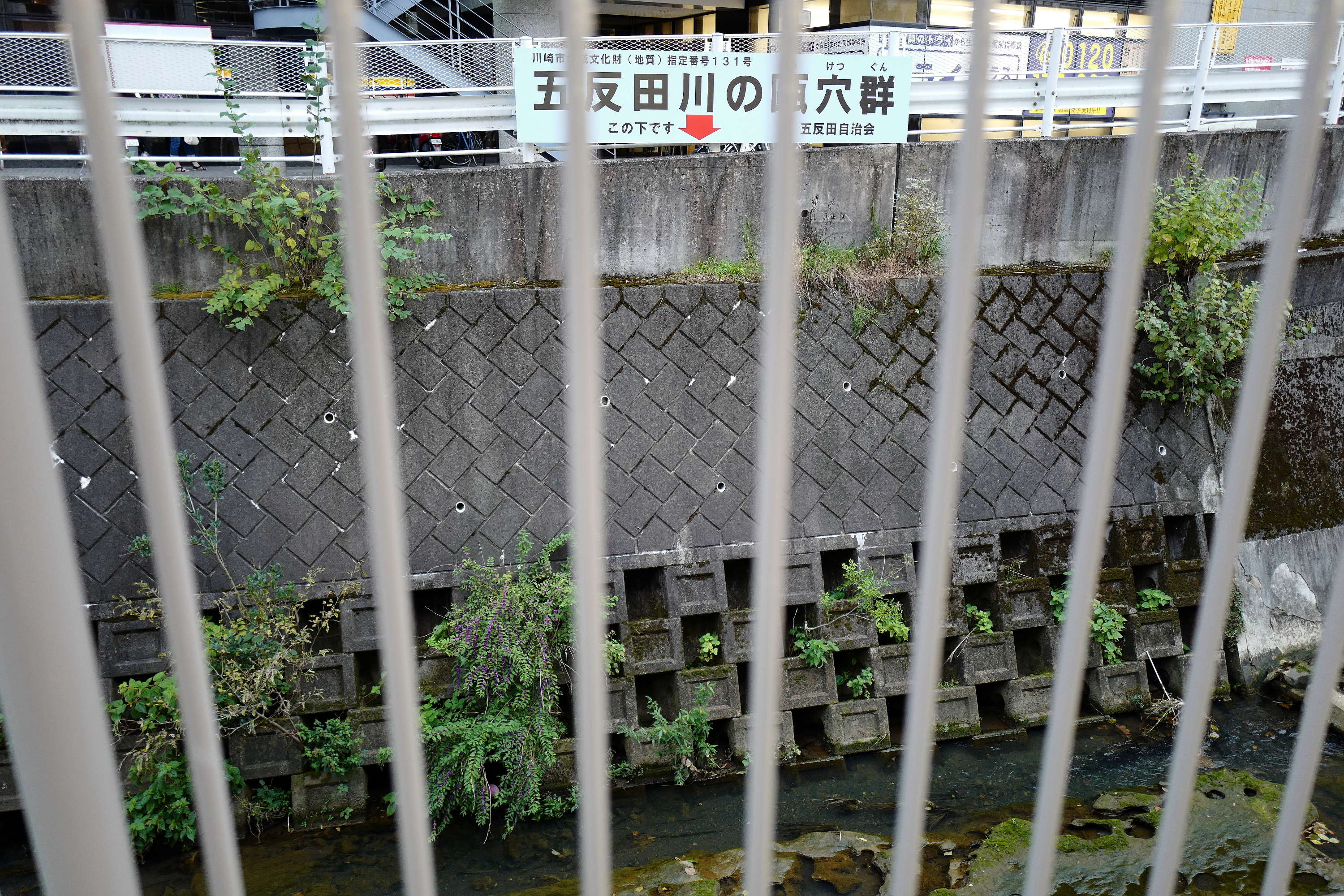 昨年度、川崎市の地域文化財に認定された「五反田川の甌穴群」は、生田駅の南口バスロータリーのすぐそばで見られます。