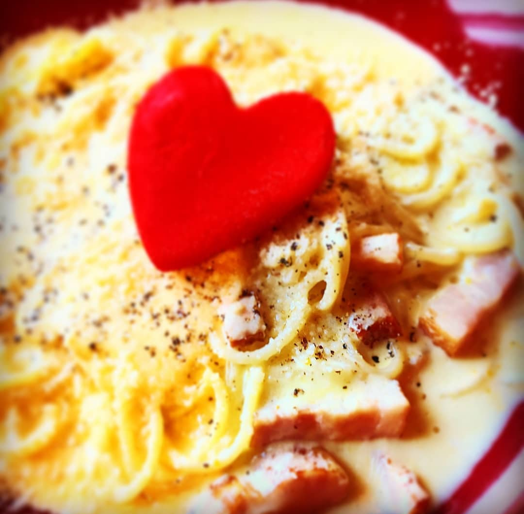 カルボナーラだけでも美味しいですが、凍ったハート型の明太子が溶け出してから混ぜて食べるとさらに美味しいです。