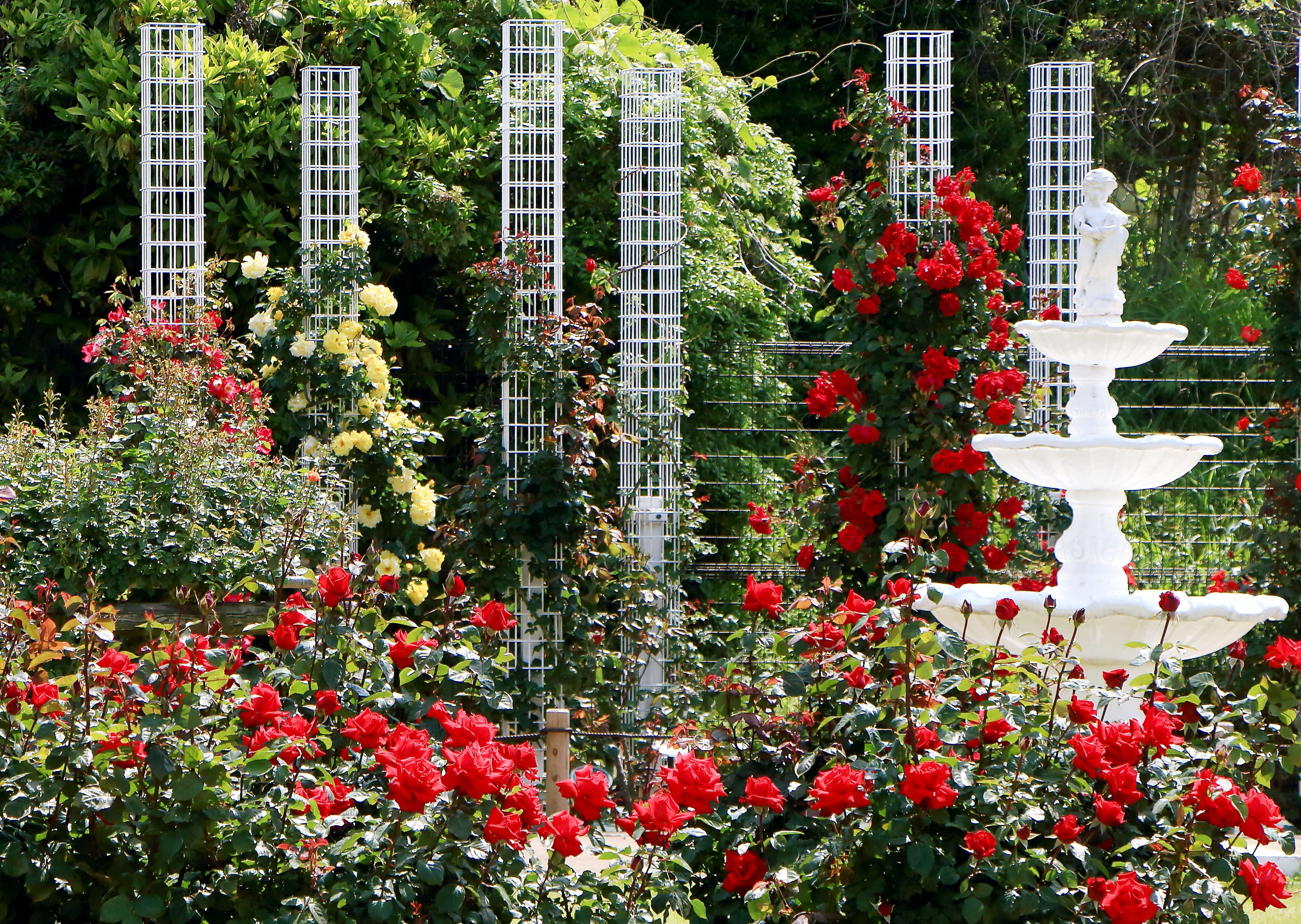 柱に沿って咲く「つるバラ」は春ならではの見どころだそうです。