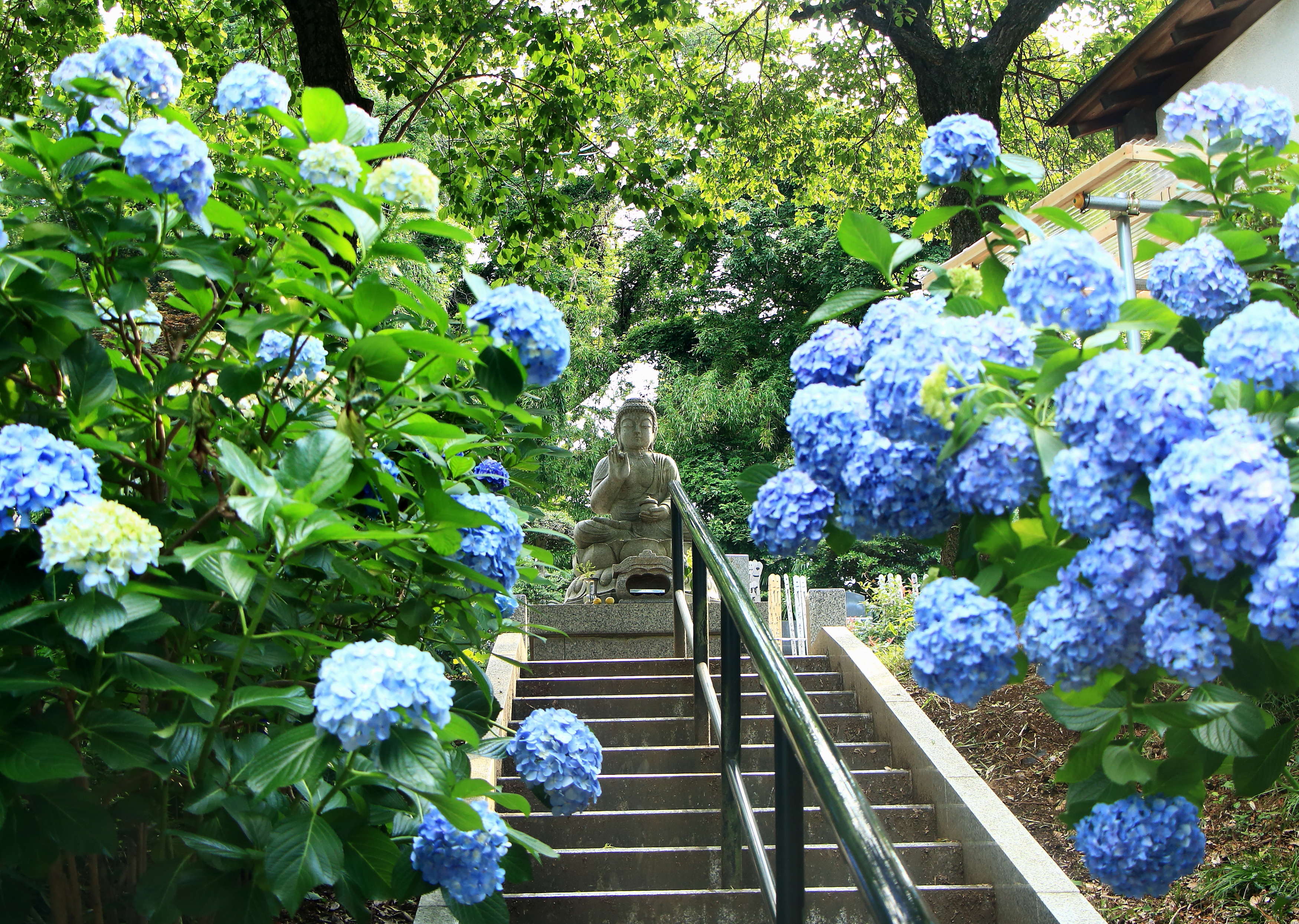 多摩区長尾にあるあじさい寺「妙楽寺」には28種約1,000株の紫陽花が植えられ、境内一面に咲いています。