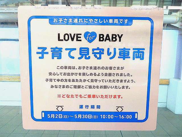 乳幼児連れで電車を利用する子育て客層が躊躇なく乗車できる様に=“LOVE for BABYプロジェクト”の意図から、5/2から5/30まで「子育て応援トレイン」が初めて運行されました。