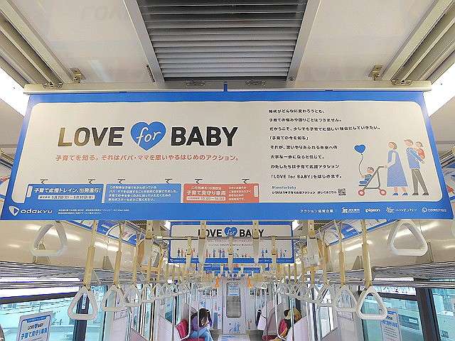特定の1車両を「子育て見守り車両」として、「子育て中の方をあたたかく見守ってください」 というステッカーが貼ってあったり、車内床面を動物の親子の足型を象ったイラストシートを貼られ子供の心をつかむ工夫があったり、子育て層向けの情報等を謳った中吊りで埋め尽くされていました。