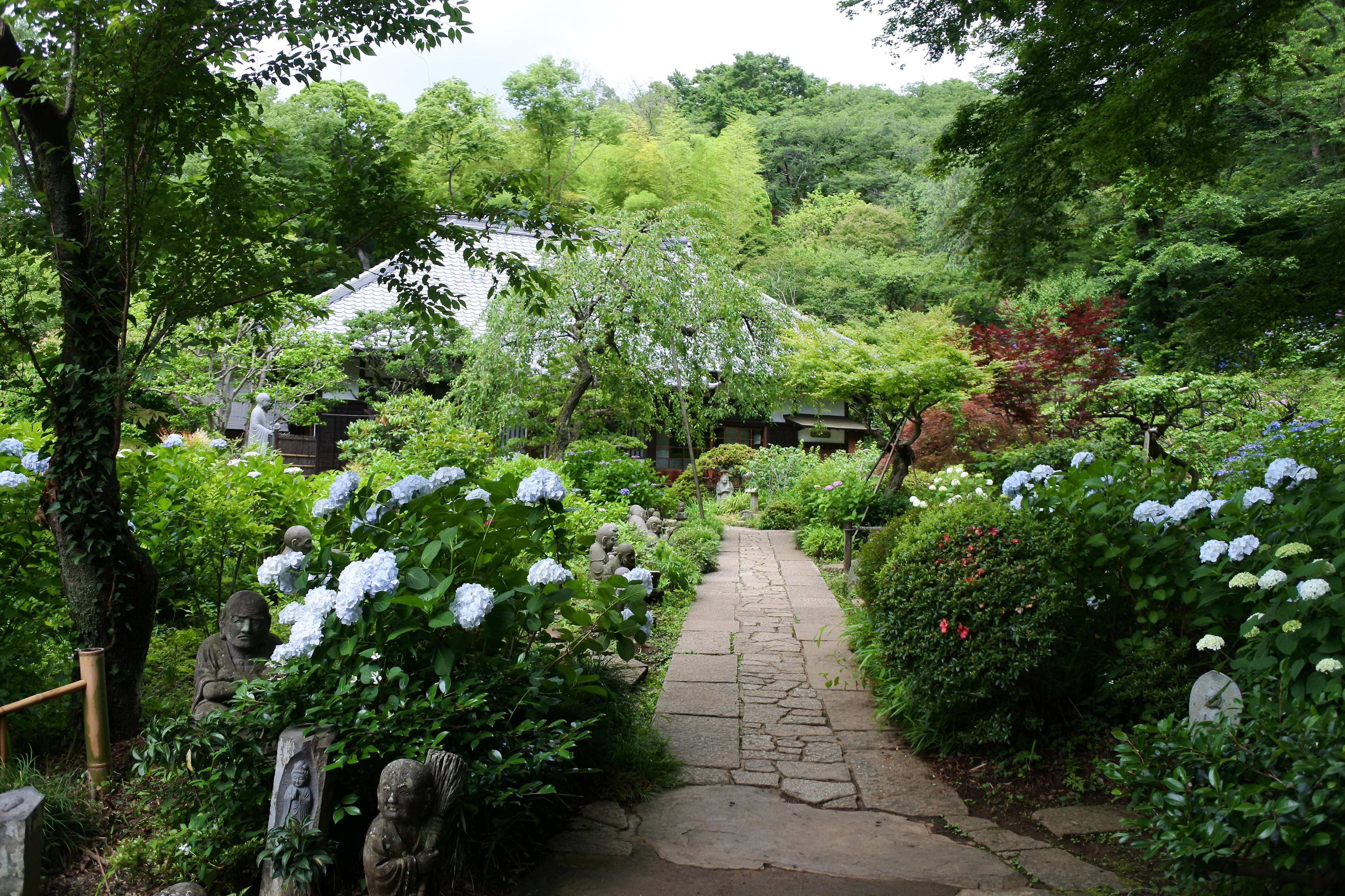 さらに進んでいくと、そこには緑とお寺と紫陽花と羅漢様の、別世界のような光景が広がっていました。