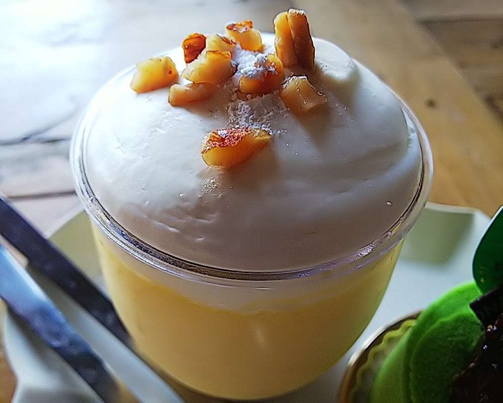 プリンの上には生クリームにキャラメリゼされたナッツがトッピングされていて、他にはない味わい。