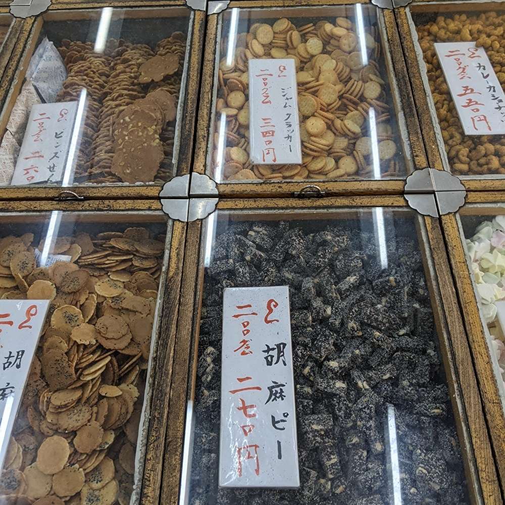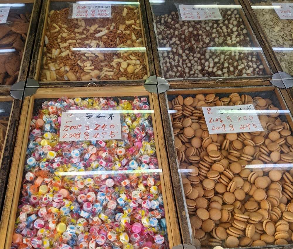 創業65年、量り売り形式のお菓子約58種類と懐かしの駄菓子が売られています。