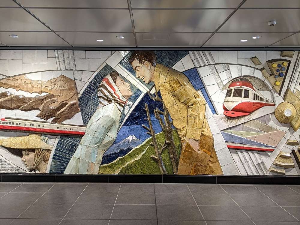 下北沢駅東口改札付近に、複々線化を記念した大きなレリーフがあります。