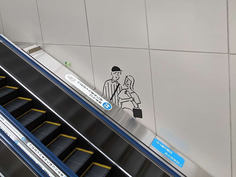 エスカレーター脇の壁には駅を利用する人びとが絵になって登場しています。