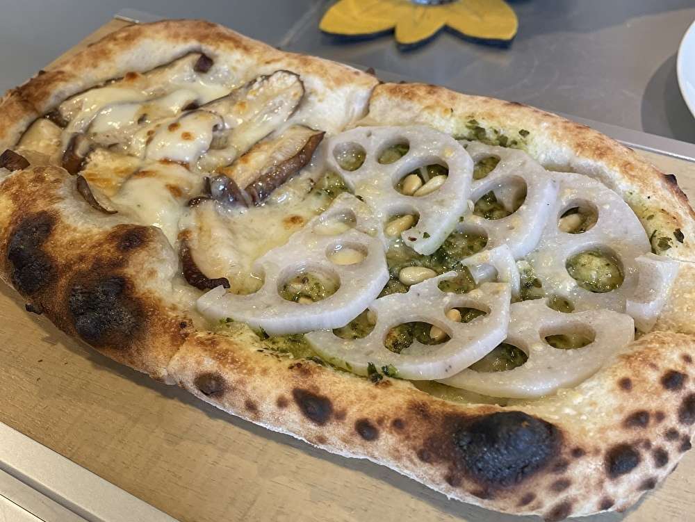 れんこんのピザは、バジルソースとれんこんの相性がよく人気の高いピザです。