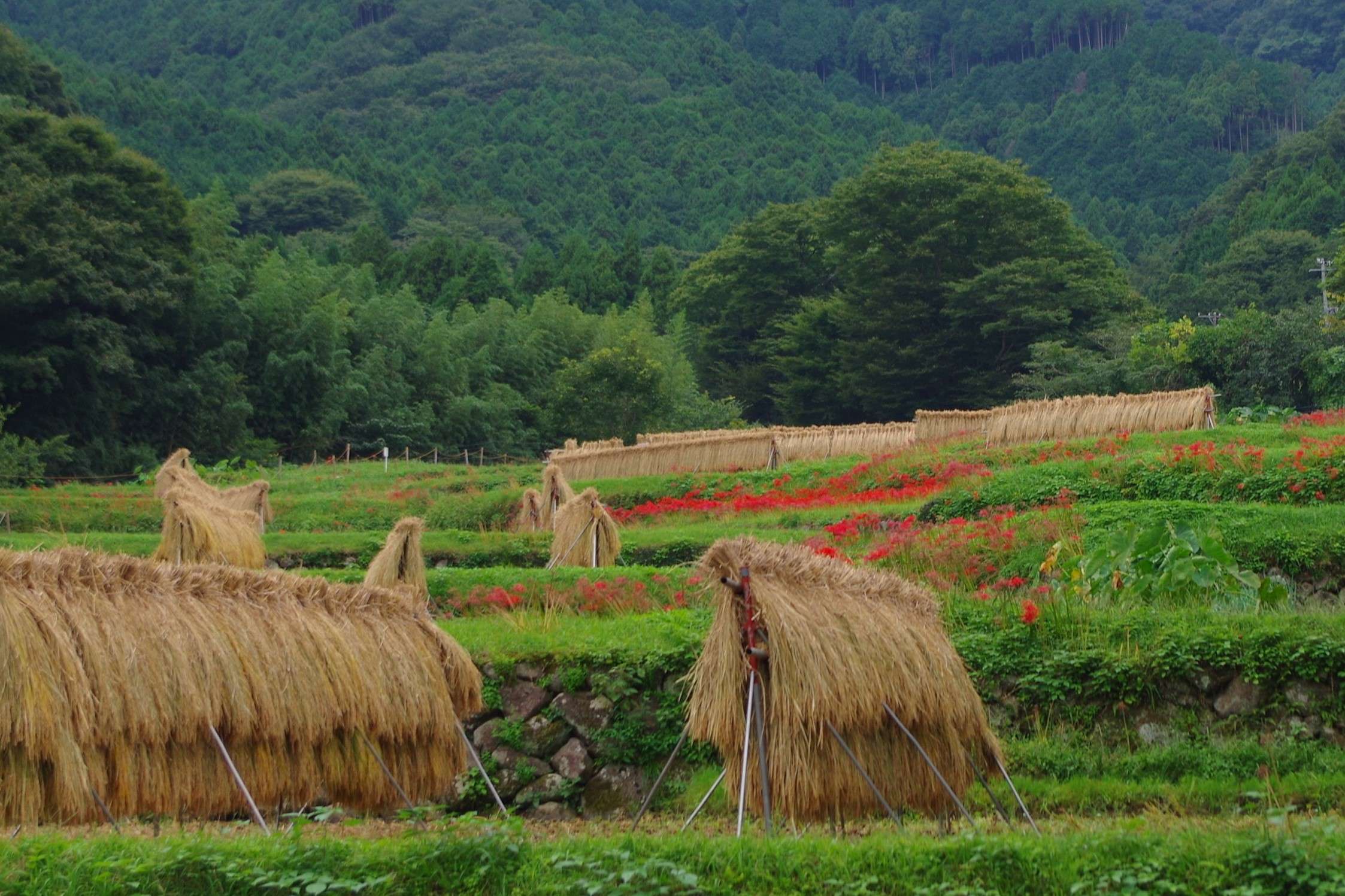 私が行った頃は彼岸花の向こうに刈り取りの終わった稲が干されていて、日本の秋といった眺めを楽しめました。