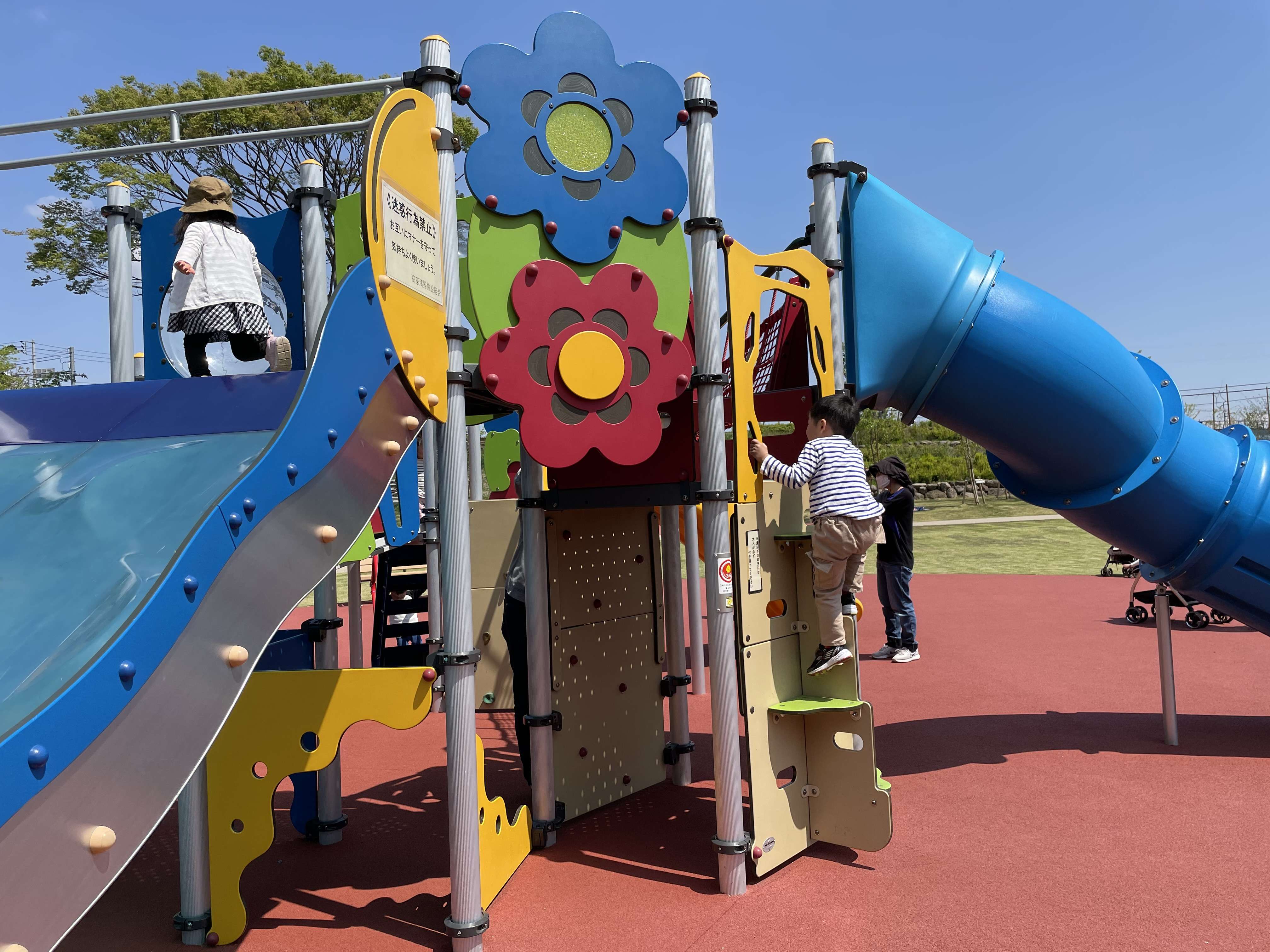 未就学児にはちょうど良い大きさのすべり台とアスレチック付きの遊具。
