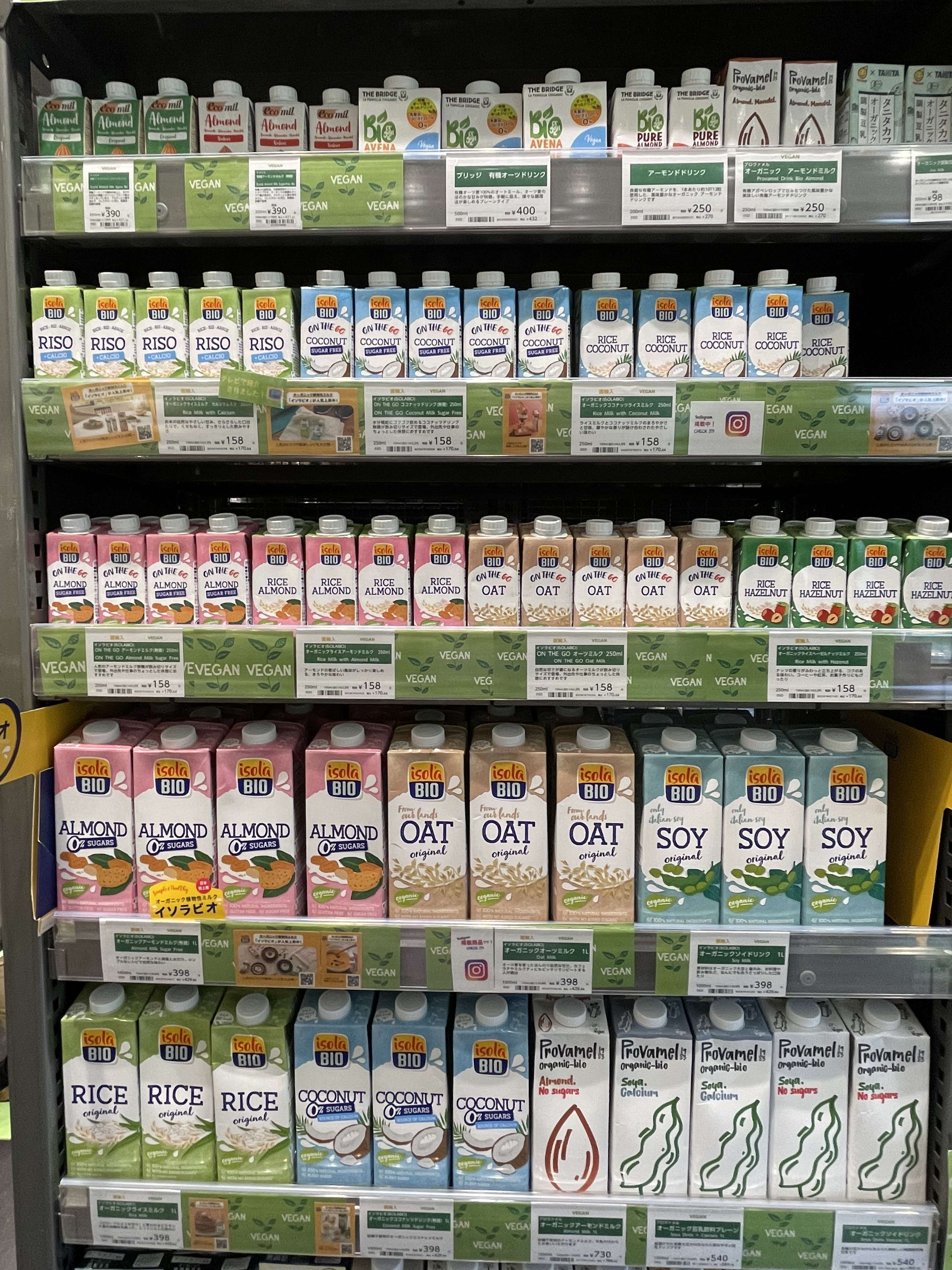 ソイ以外にも、最近人気のオーツミルクやライスミルク、ココナッツミルクなど、フレーバーも多数が並びます。
