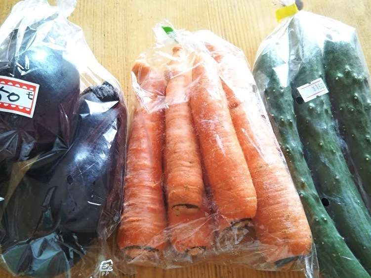 購⼊したのは、きゅうり、にんじん、なすの3点。