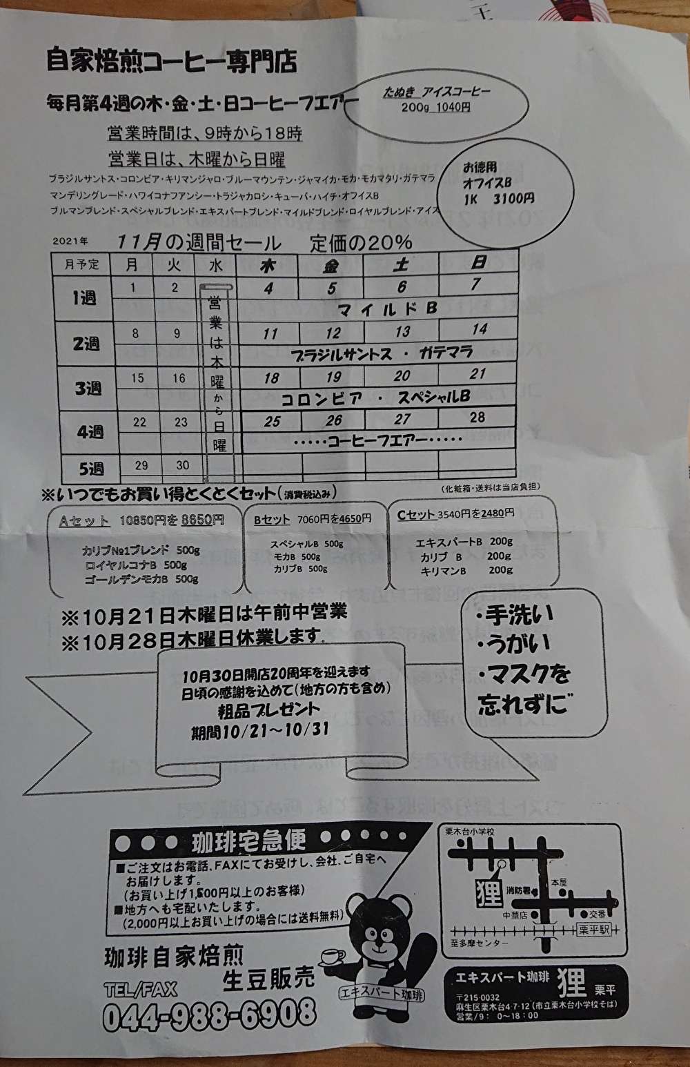 栗平の小学校の通学路に、タヌキが目印の小さなコーヒー豆屋さんがあります。