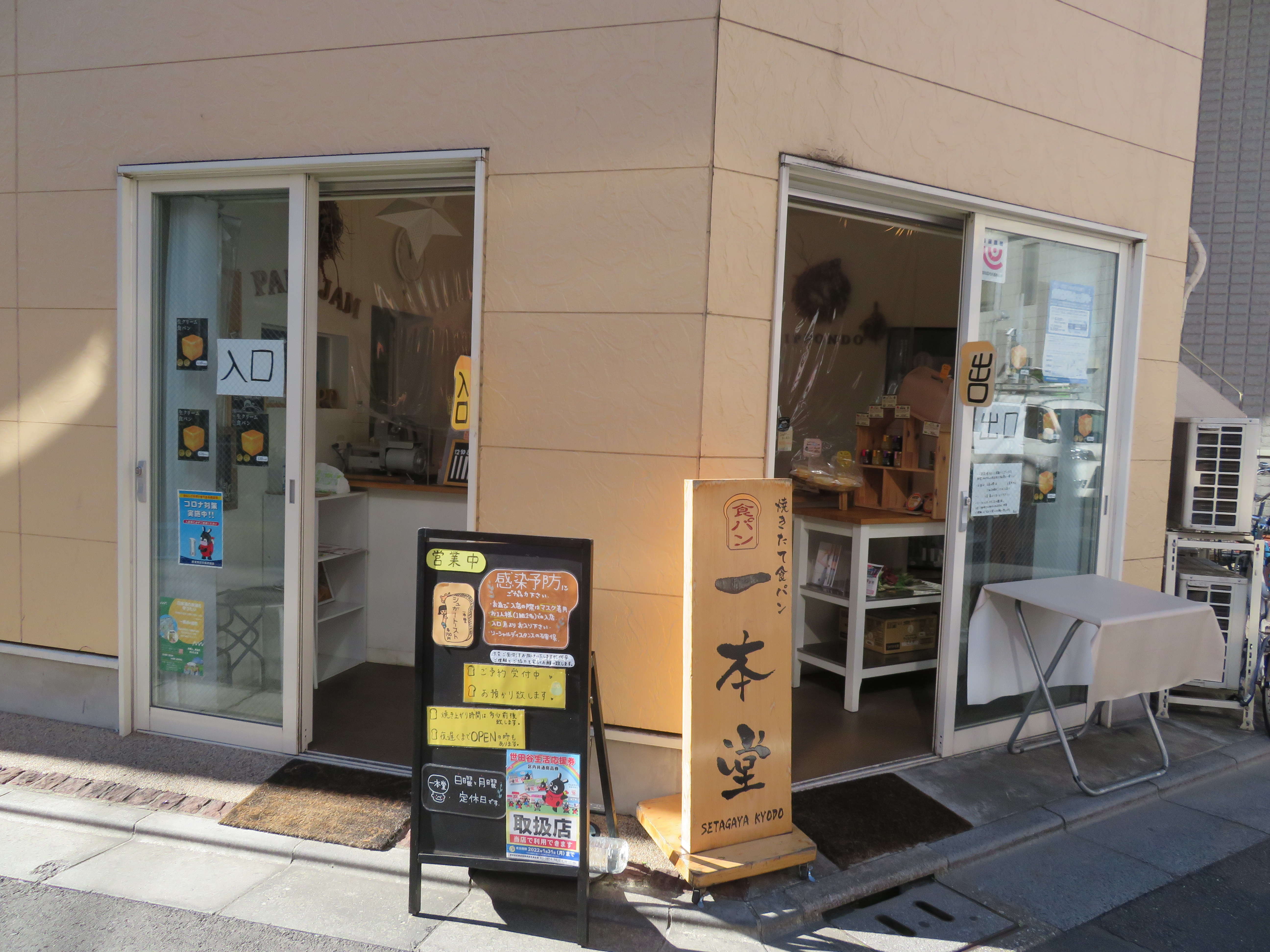 焼きたて食パン専門店として、大阪の住宅街で創業した「一本堂」の世田谷経堂店。使用する原材料にこだわっており、たとえば小麦は「国産」2種類と「北米産」「国内産小麦とオーツ麦の外皮、大豆粉などを配合したもの」をパンごとに使い分けています。