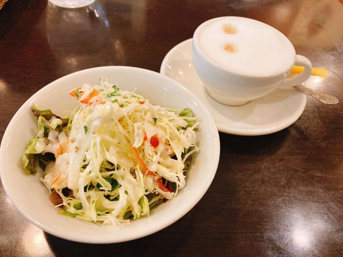 この日、私はサラダとカフェラテのセット、一緒にランチをした夫はサラダとワインのセットを付けました。