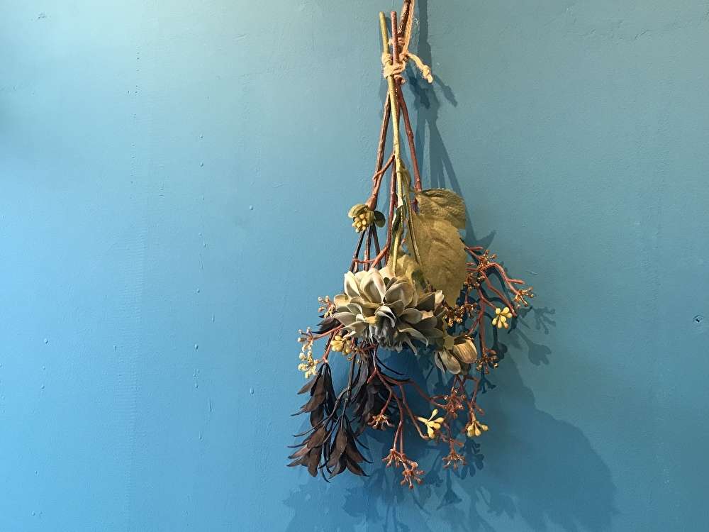 店内は青い壁にドライフラワーのスワッグが飾られていてすてき!