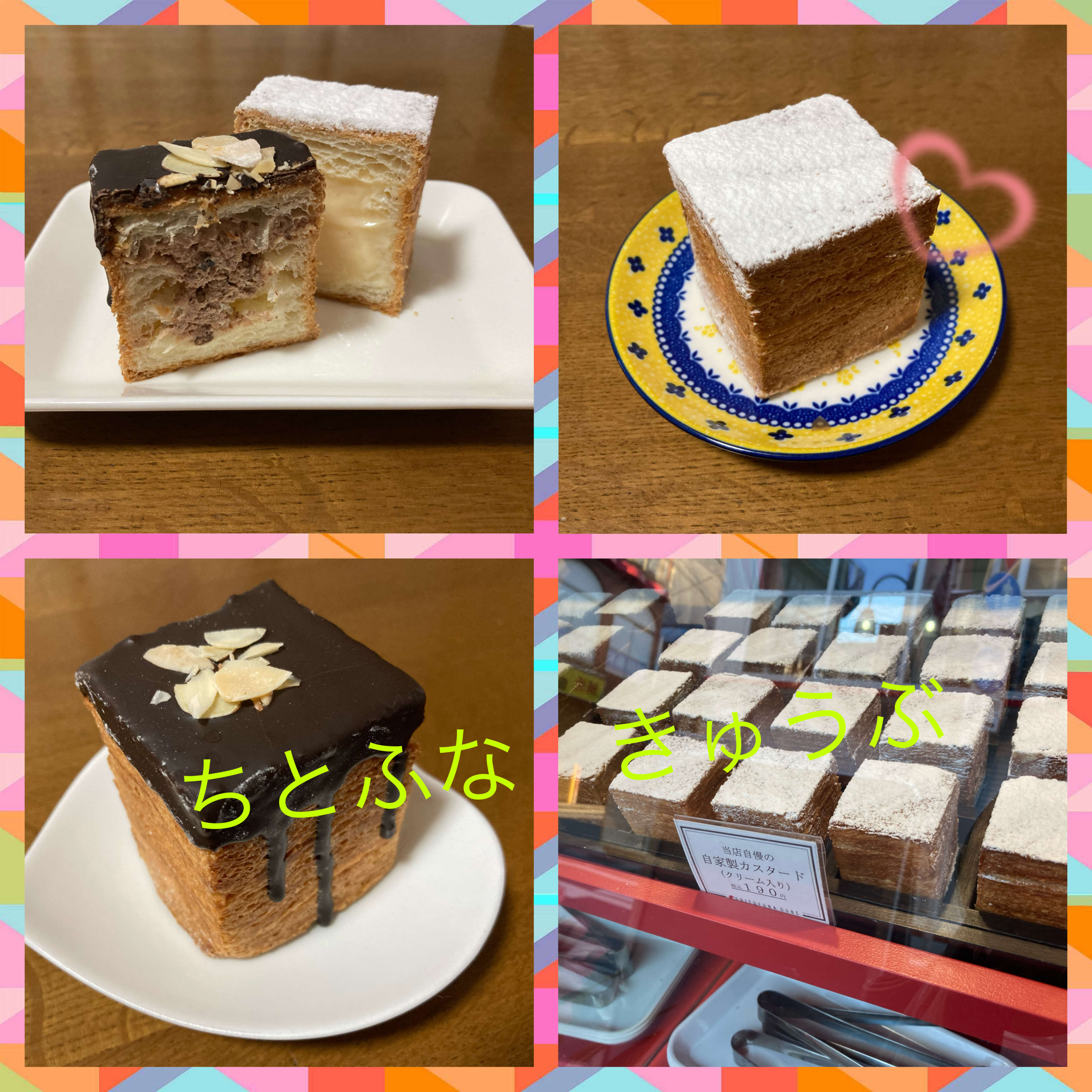 自家製カスタード、ヴェローナチョコクリーム、フランボワーズクリーム、シチリアレモンチーズクリーム、超ザクザクカソナード、ピザトーストの6種の一辺5㎝ほどのキューブにクリームがイン、おしゃれなコーティングは映えです。