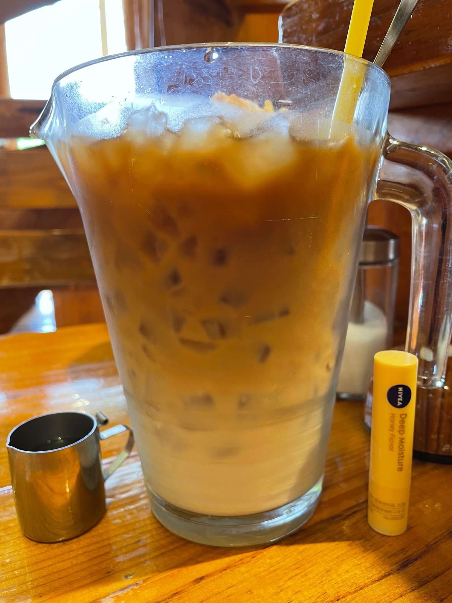 アイスカフェオレはビールのジョッキ位のグラスになみなみと、