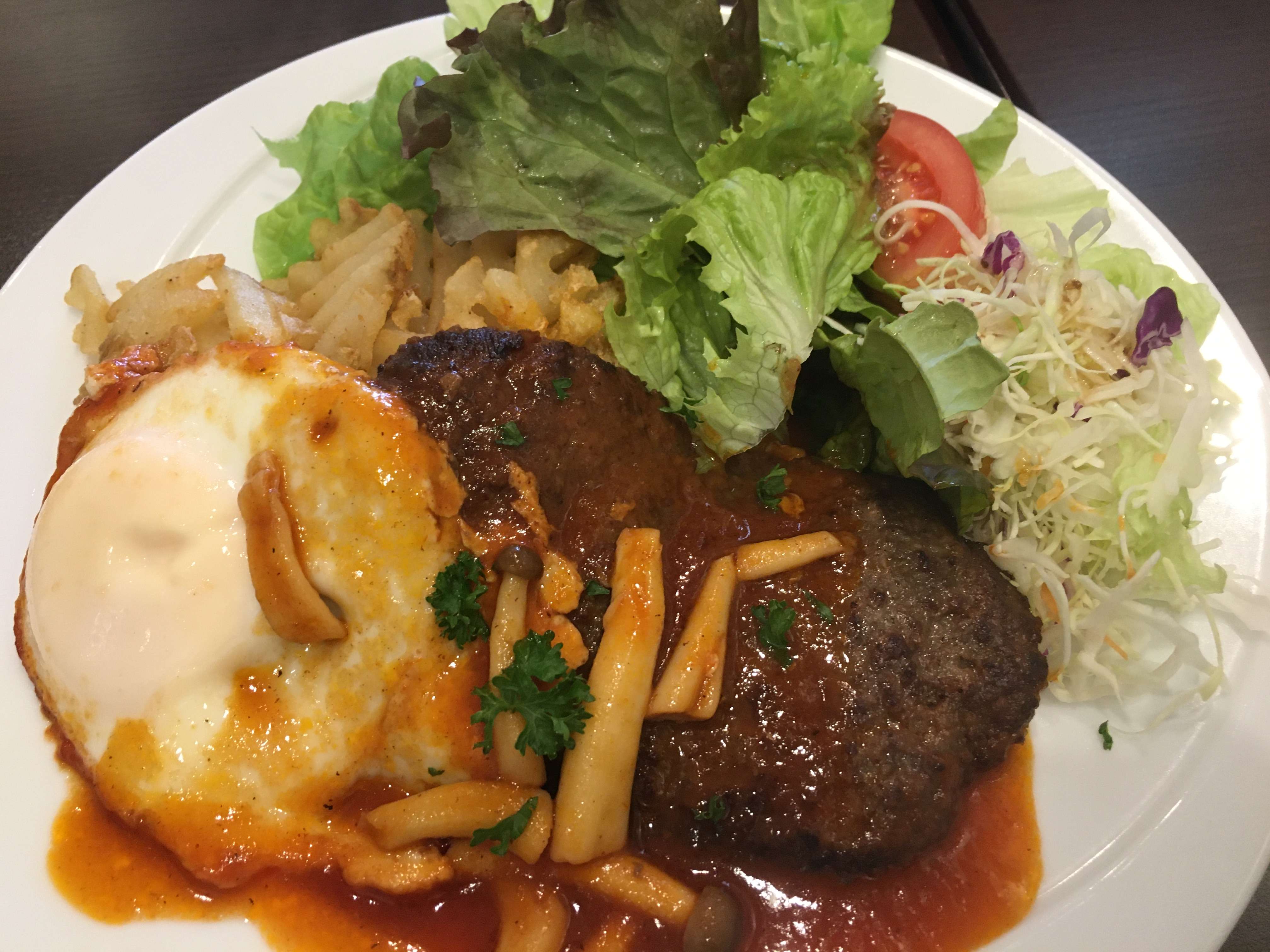 ハンバーグには目玉焼きやポテトフライも付いていました