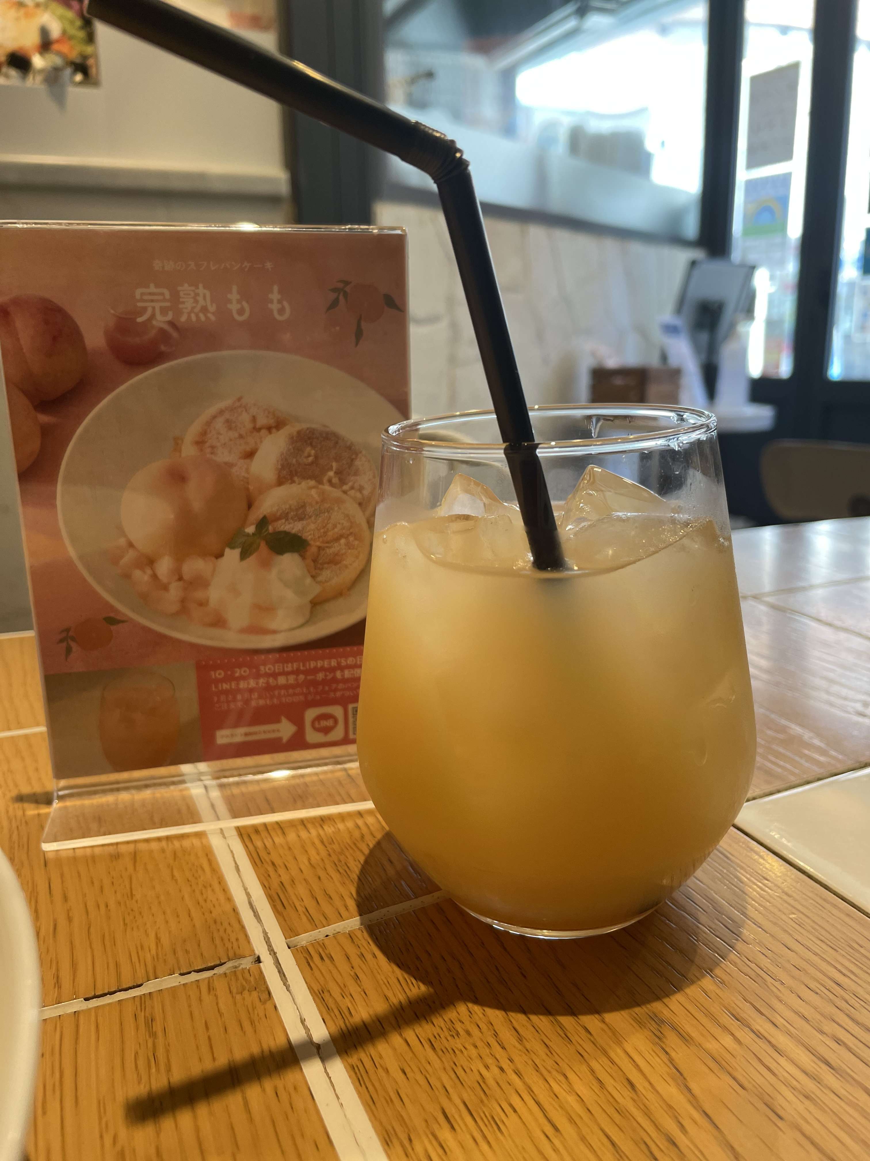 「奇跡のパンケーキ 完熟もも」を注文して、LINEで入手したクーポンを提示すると「完熟もも100%ジュース」が無料!