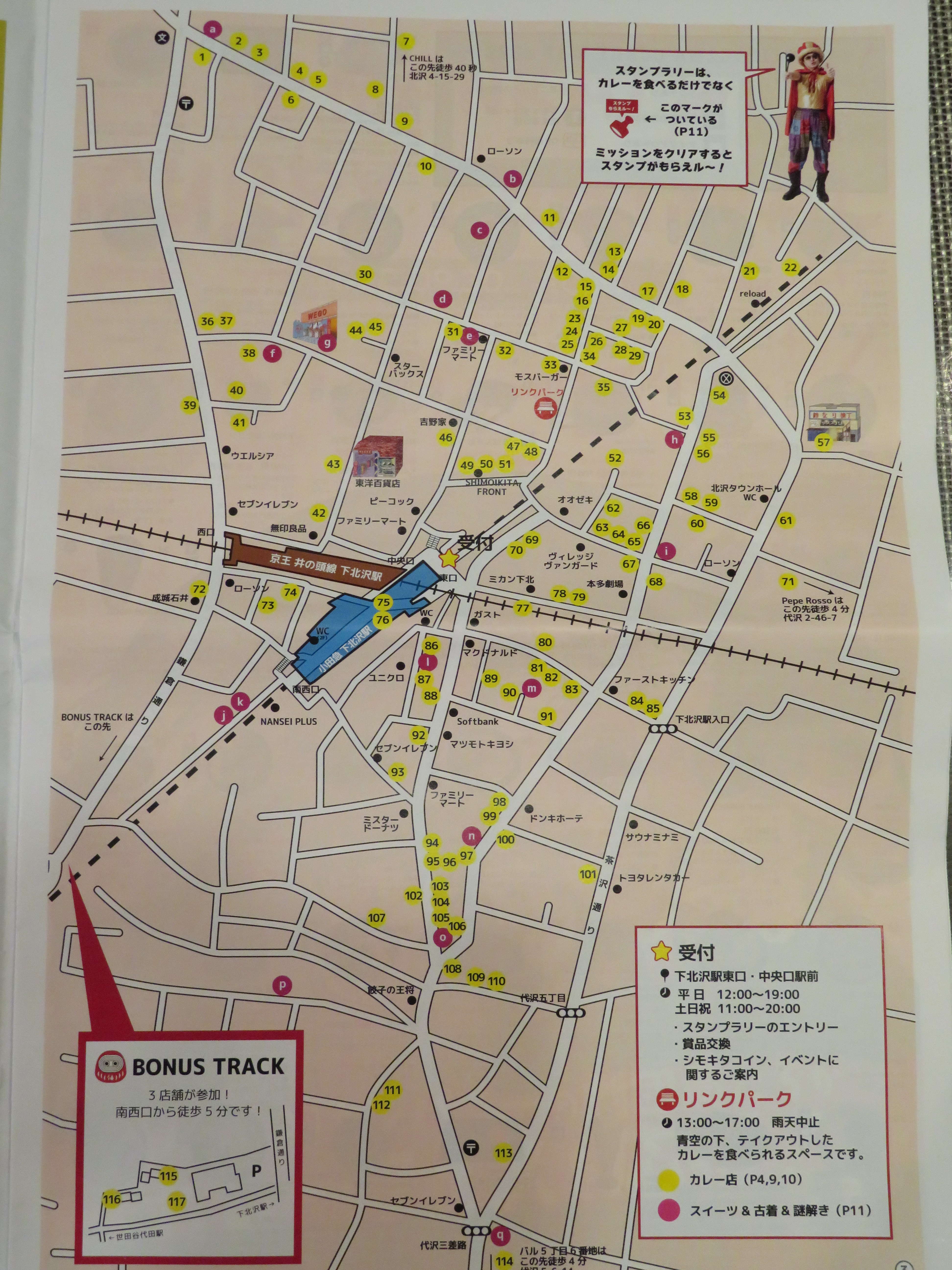 たまたま9月末〜10月末に下北沢カレーフェスティバル開催中で、街中のあちこちに参加店舗の番号が貼ってあるという面白い光景でした。