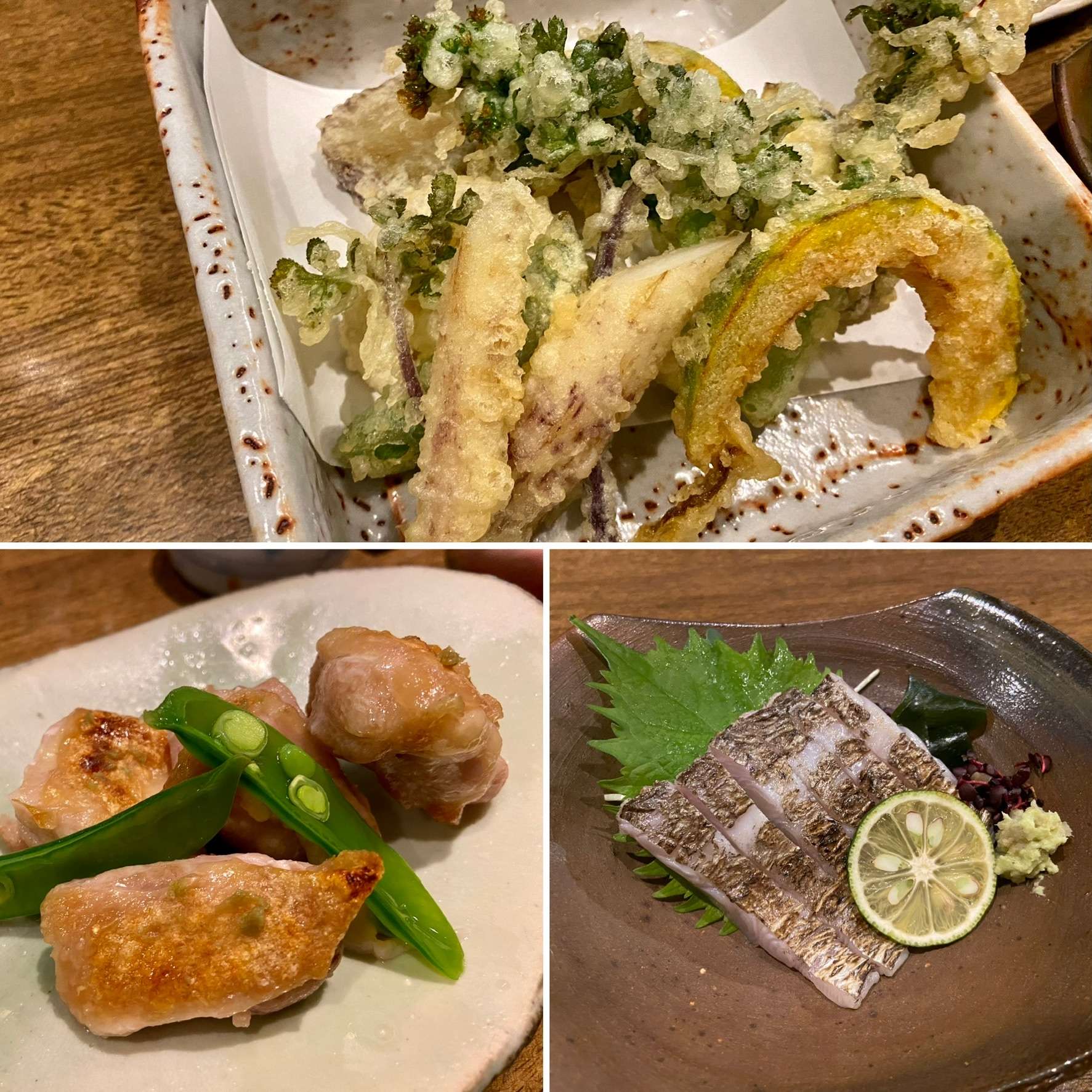野菜の天ぷら、鶏の柚子胡椒焼き、太刀魚の炙り。