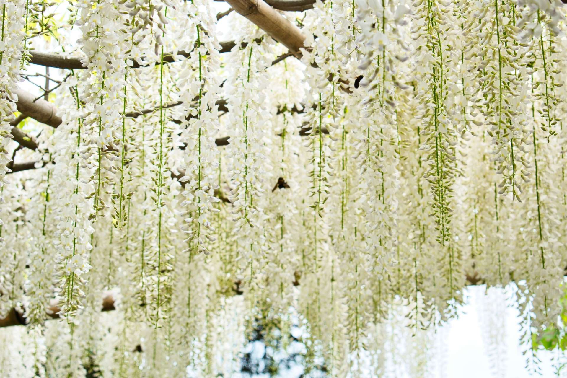 1m余りの花房を幾重にもつけた藤は、なんとも美しく、幻想的。まだ白い藤の花を見たことがない方は、今年はぜひ、白旗神社で真っ白な「義経藤」を鑑賞してみてくださいね。