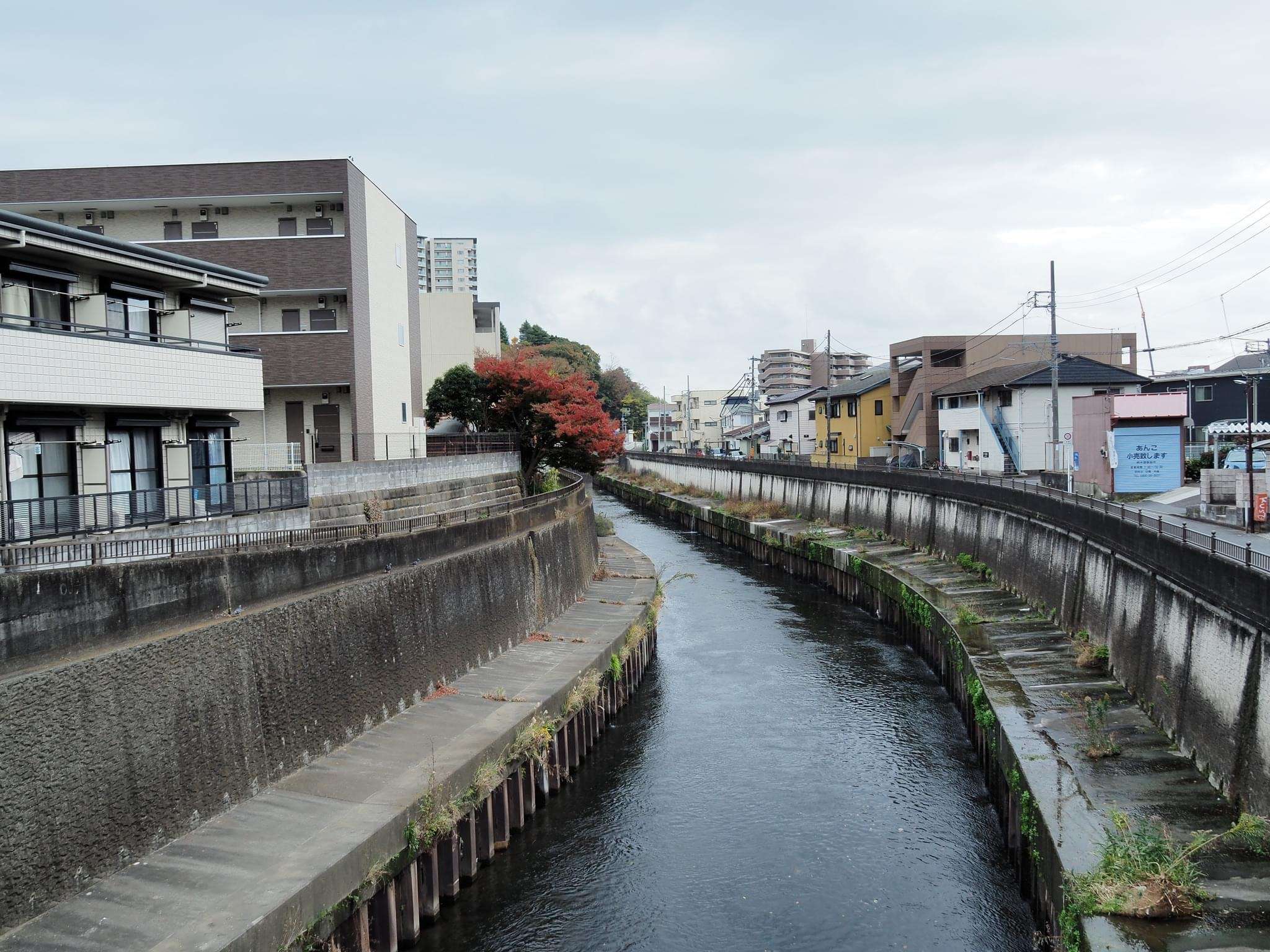 神社の背後に流れる境川。