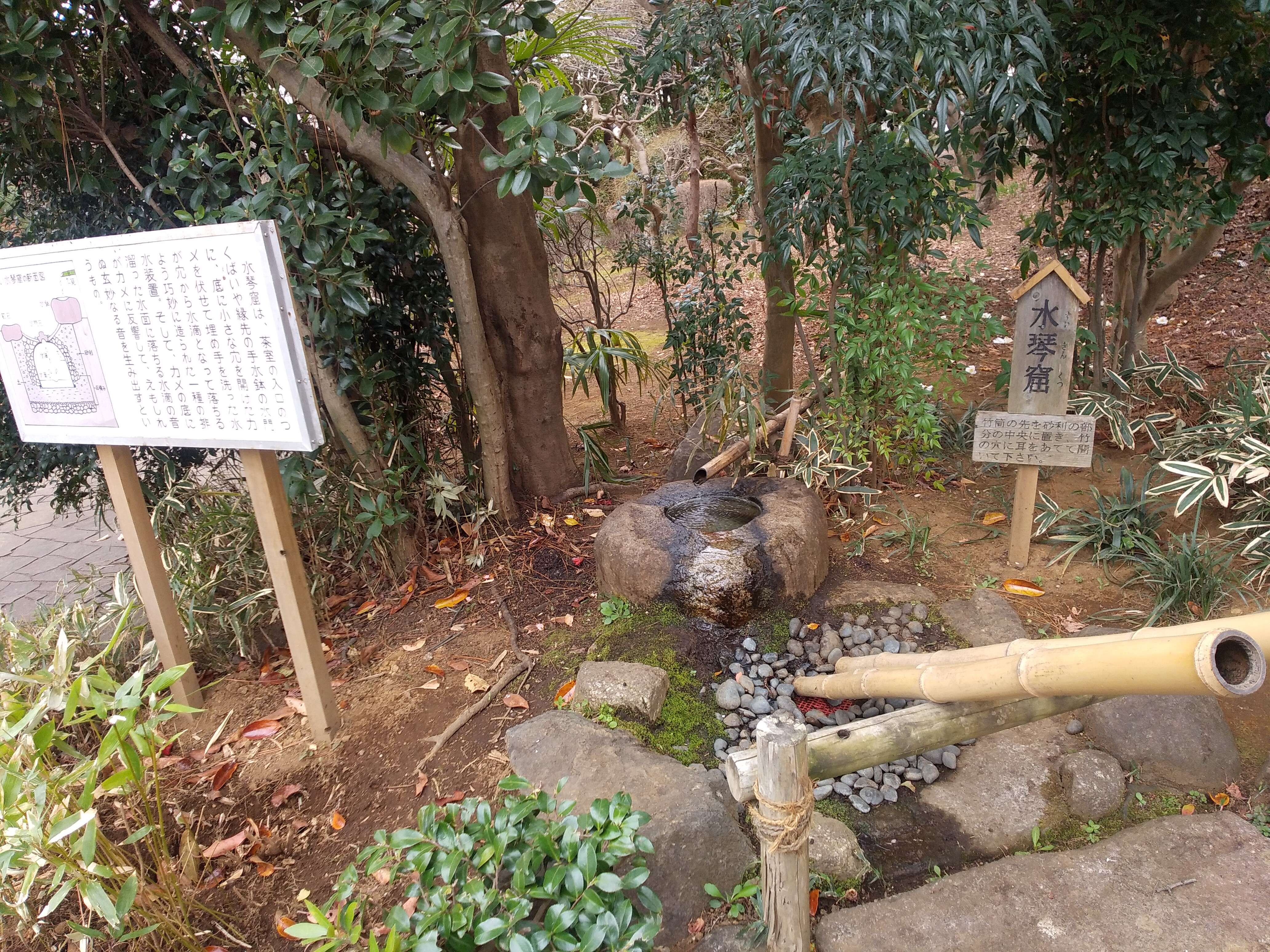 わりと広くて小さな遊歩道がたくさんあり、あずまやにベンチにトイレ、水琴窟までありました。