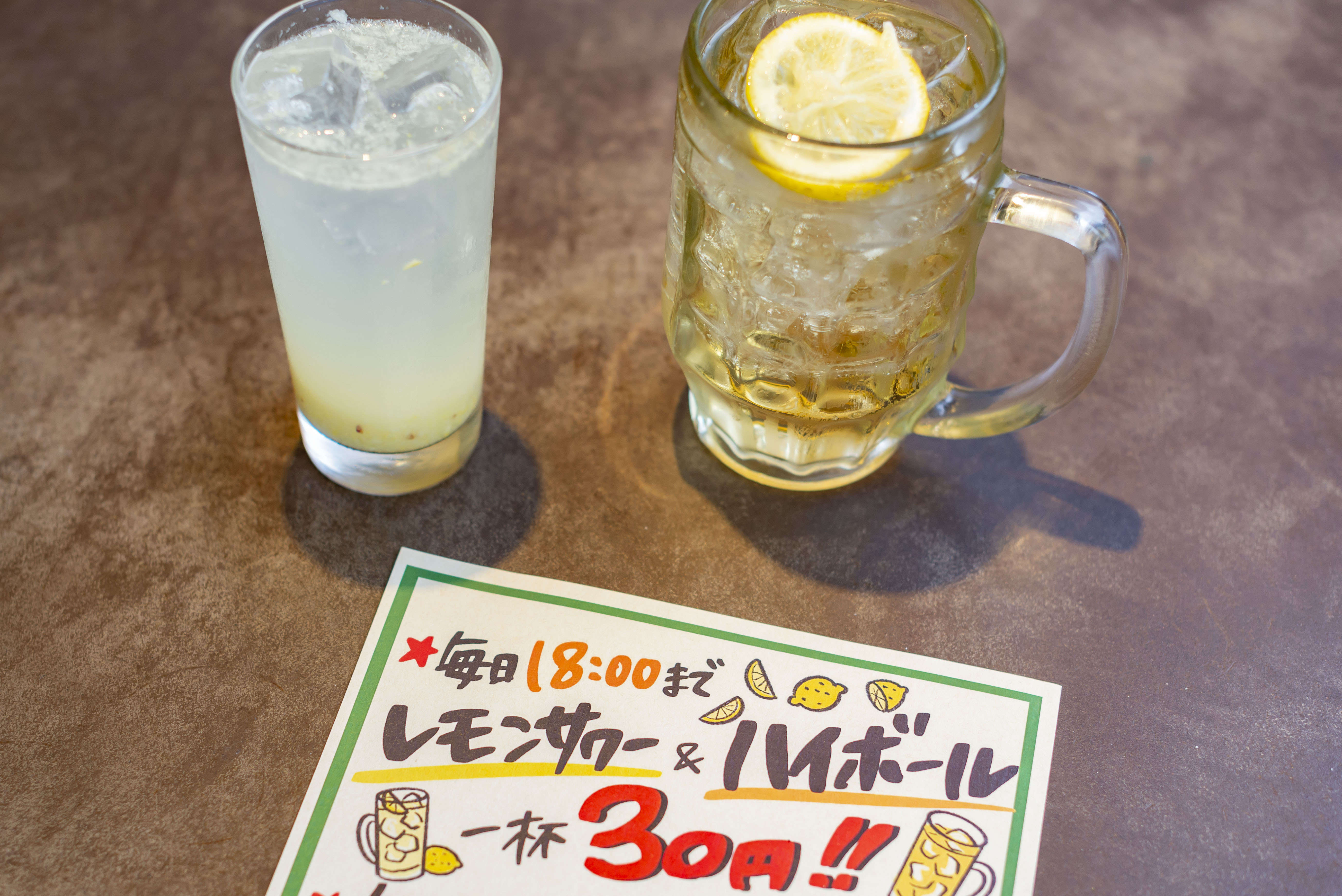 毎日18:00までは自家製レモンサワーとハイボールが、何杯飲んでも1杯30円!