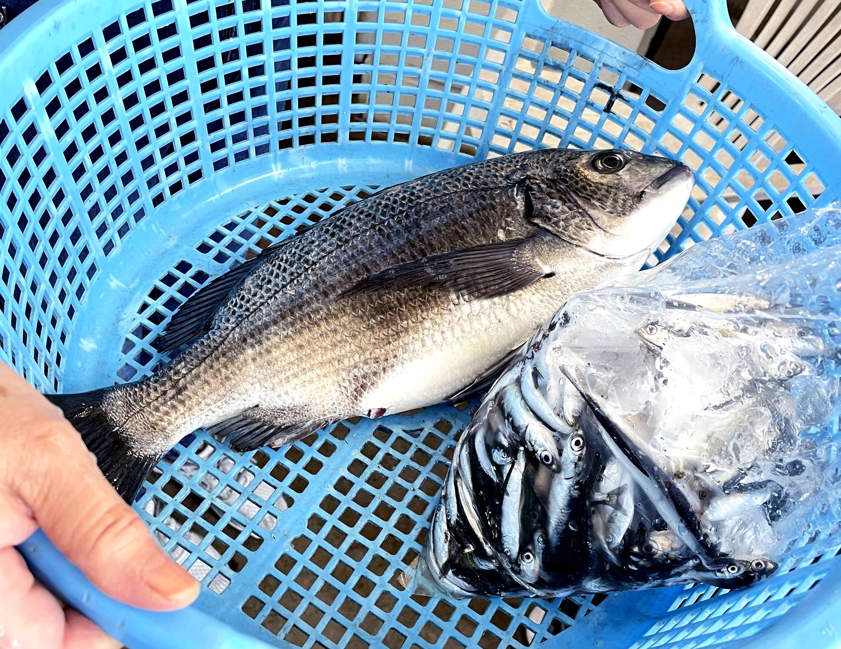 1.4キロのクロダイは700円、一袋2キロはありそうなシコイワシは、この量でたったの100円でした!