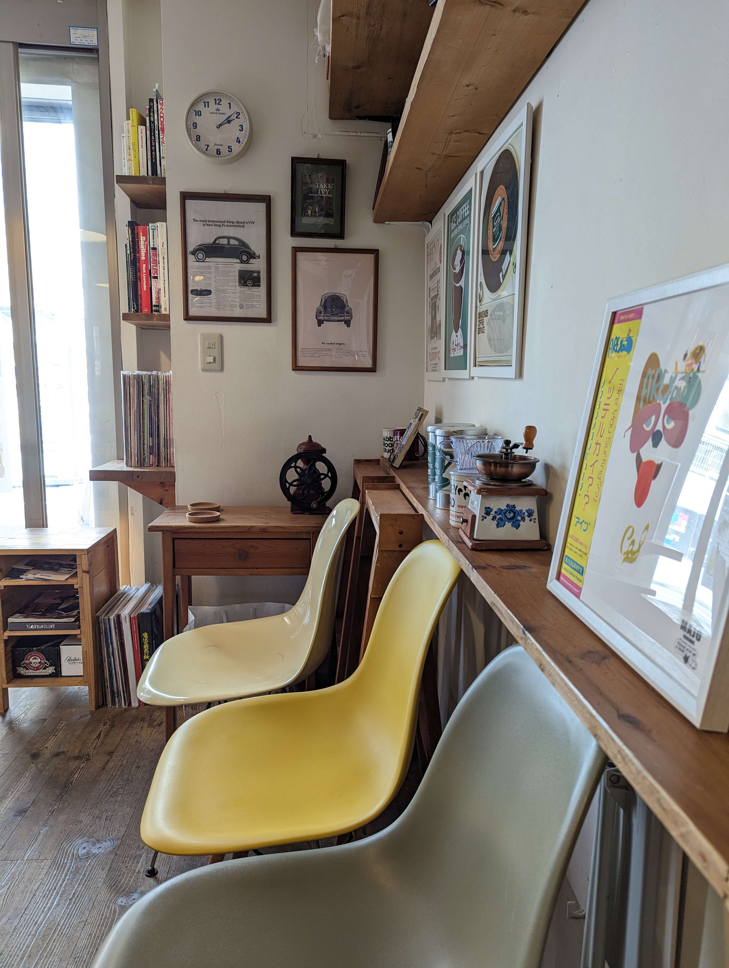 カウンターには、コーヒー豆が円筒のガラスケースに並べられコーヒー好きのわたしには癒やしの空間。