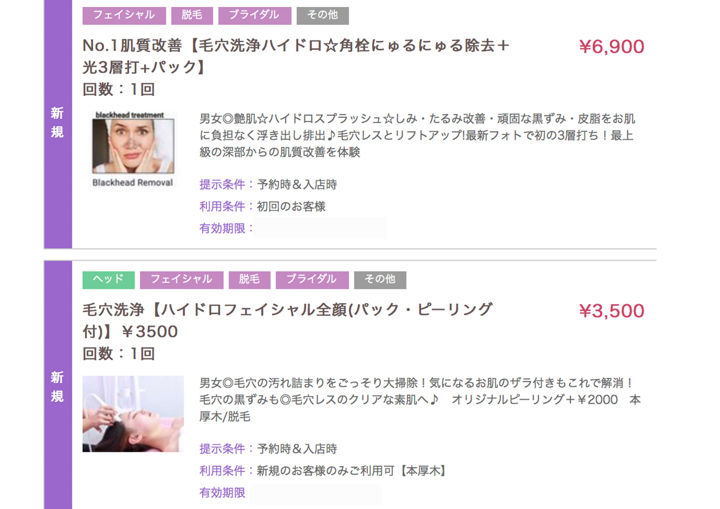 毛穴洗浄ハイドロスプラッシュのメニュー