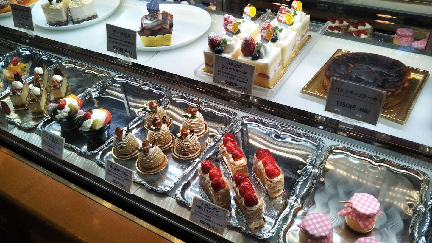 ショーケースには、おいしそうなケーキがたくさん並んでいます。
