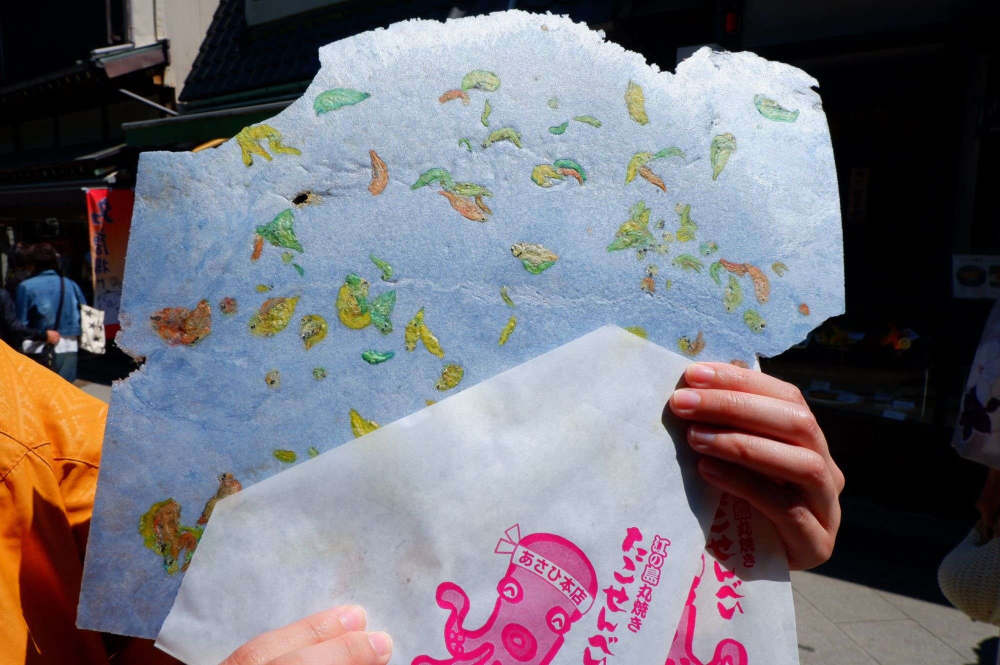 タコせんべいは新鮮なタコに粉をまぶして185℃に熱した鉄板で2分間プレスしたもの。