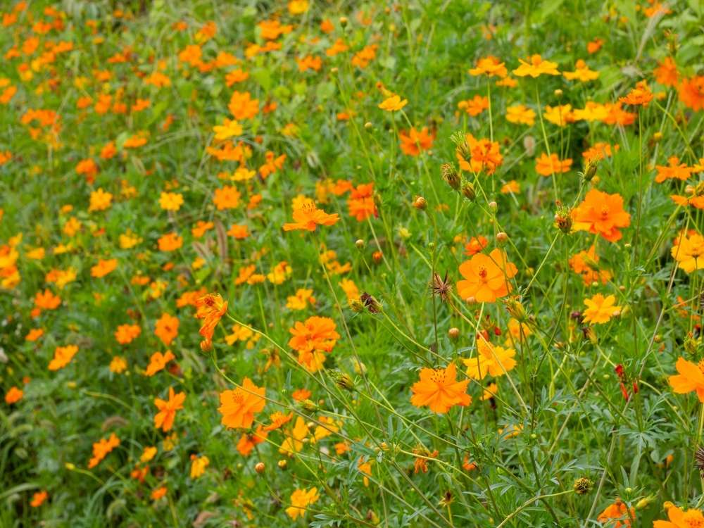 それは黄色やオレンジ色の花を咲かせる「キバナコスモス」という品種。このキバナコスモスは6~11月まで花を咲かせ、8月~9月上旬ごろが見頃になります。