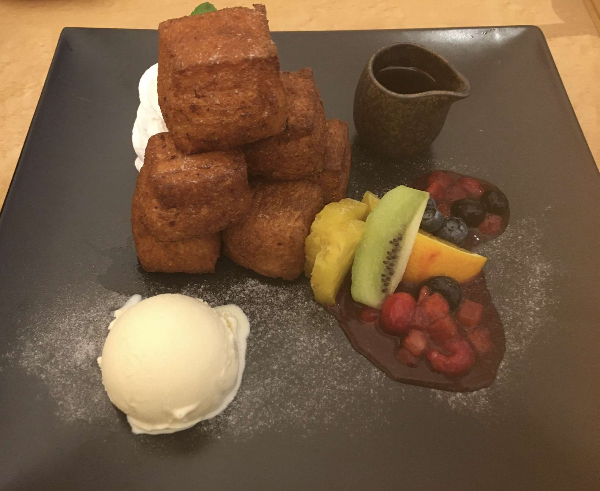 フレンチトーストは普通の物とは少し違っていて、揚げているタイプで、周りはサクサクで中はふんわりしています。