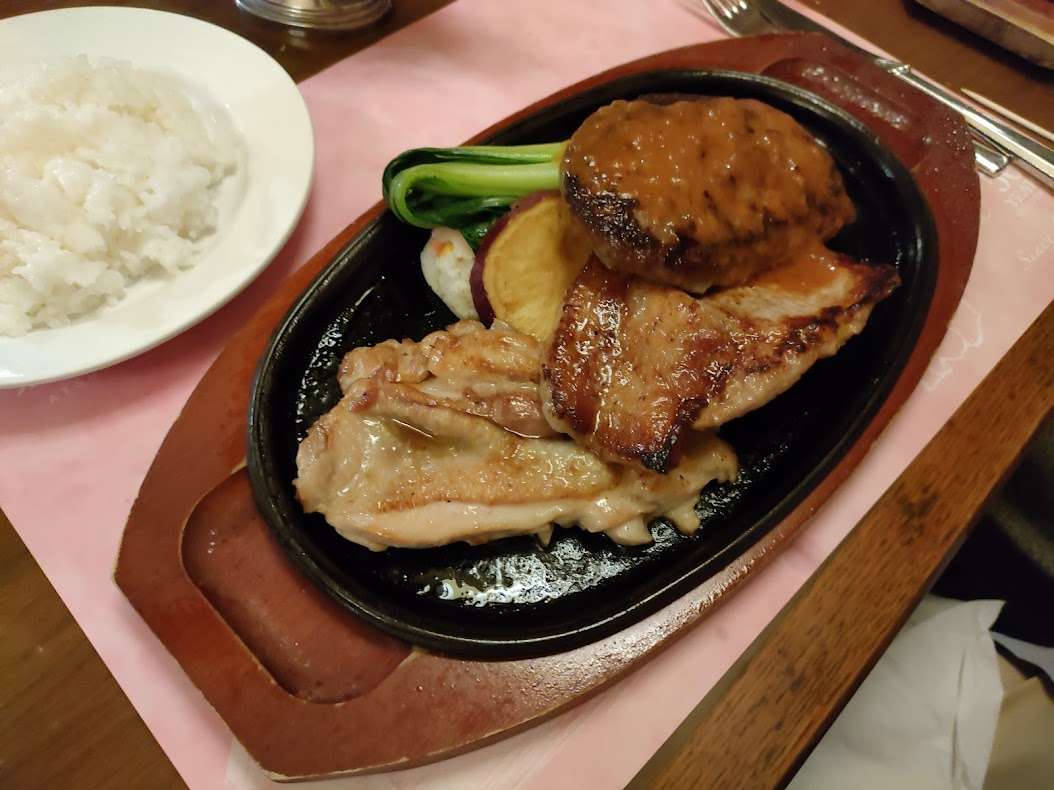 若鳥のグリルと米沢豚のソテー、手作りハンバーグが一皿に乗った「食べ比べ3兄弟」は