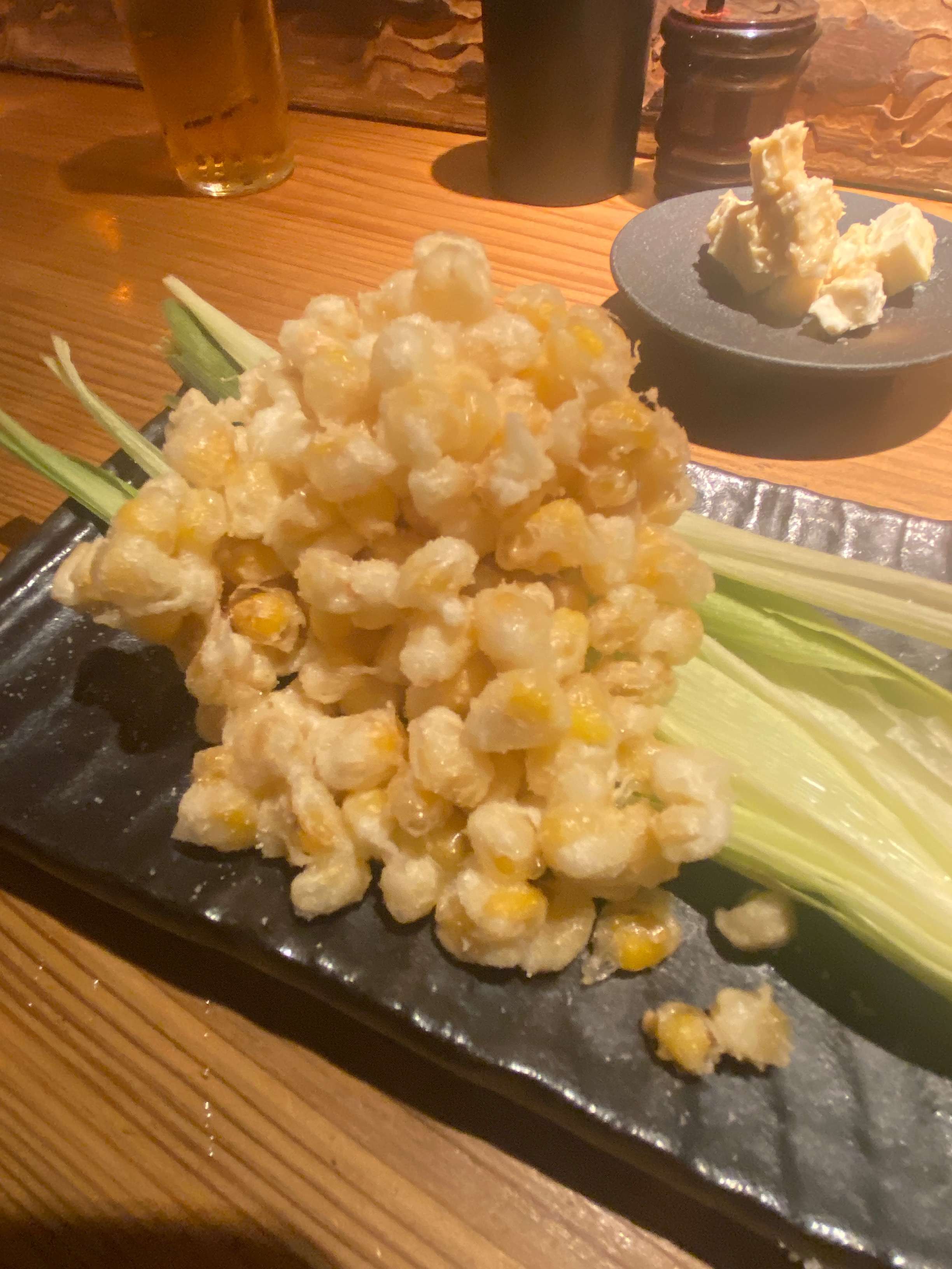 夏らしいとうもろこしのかき揚げはとうもろこしの甘味と衣の塩味が絶妙でとてもおいしかったです。